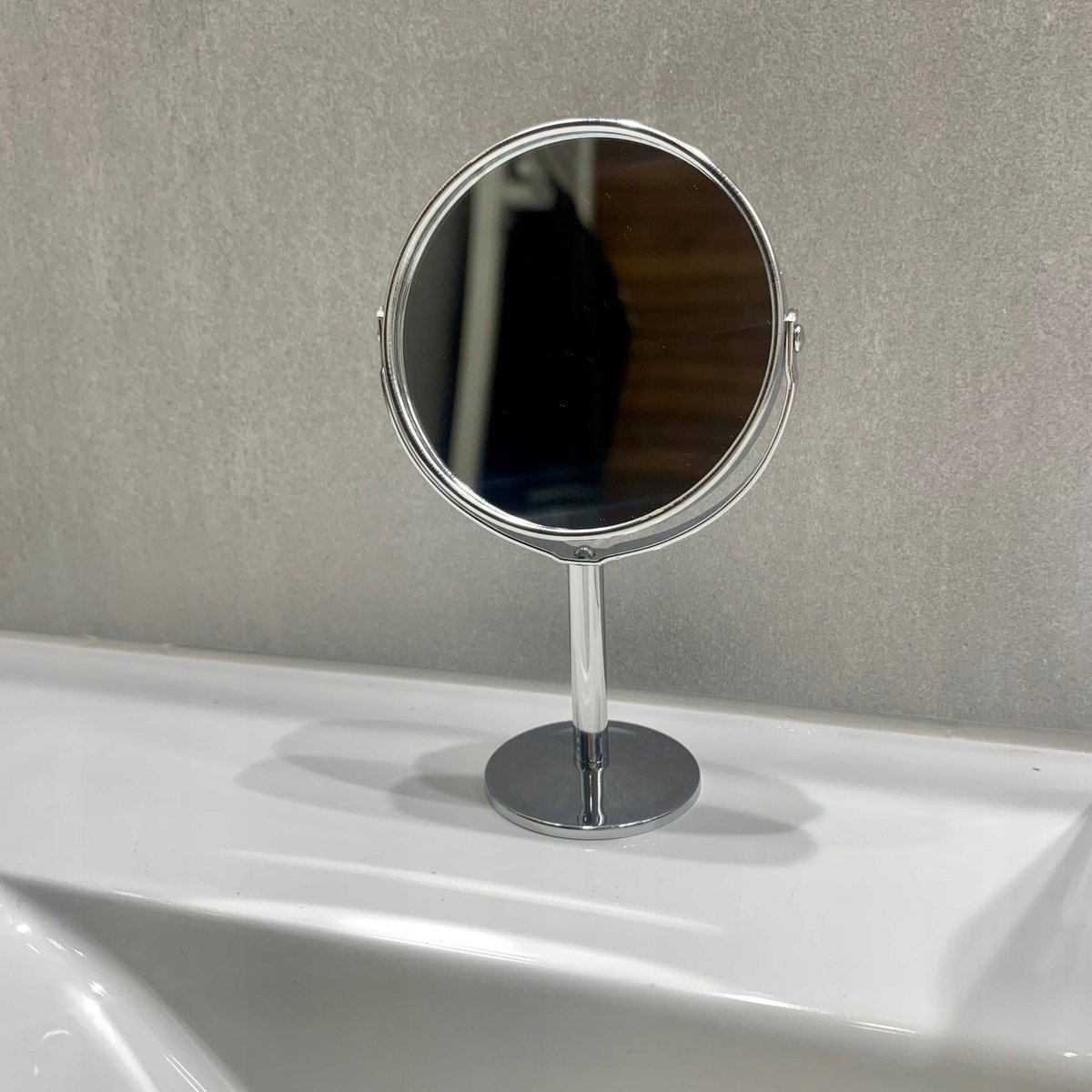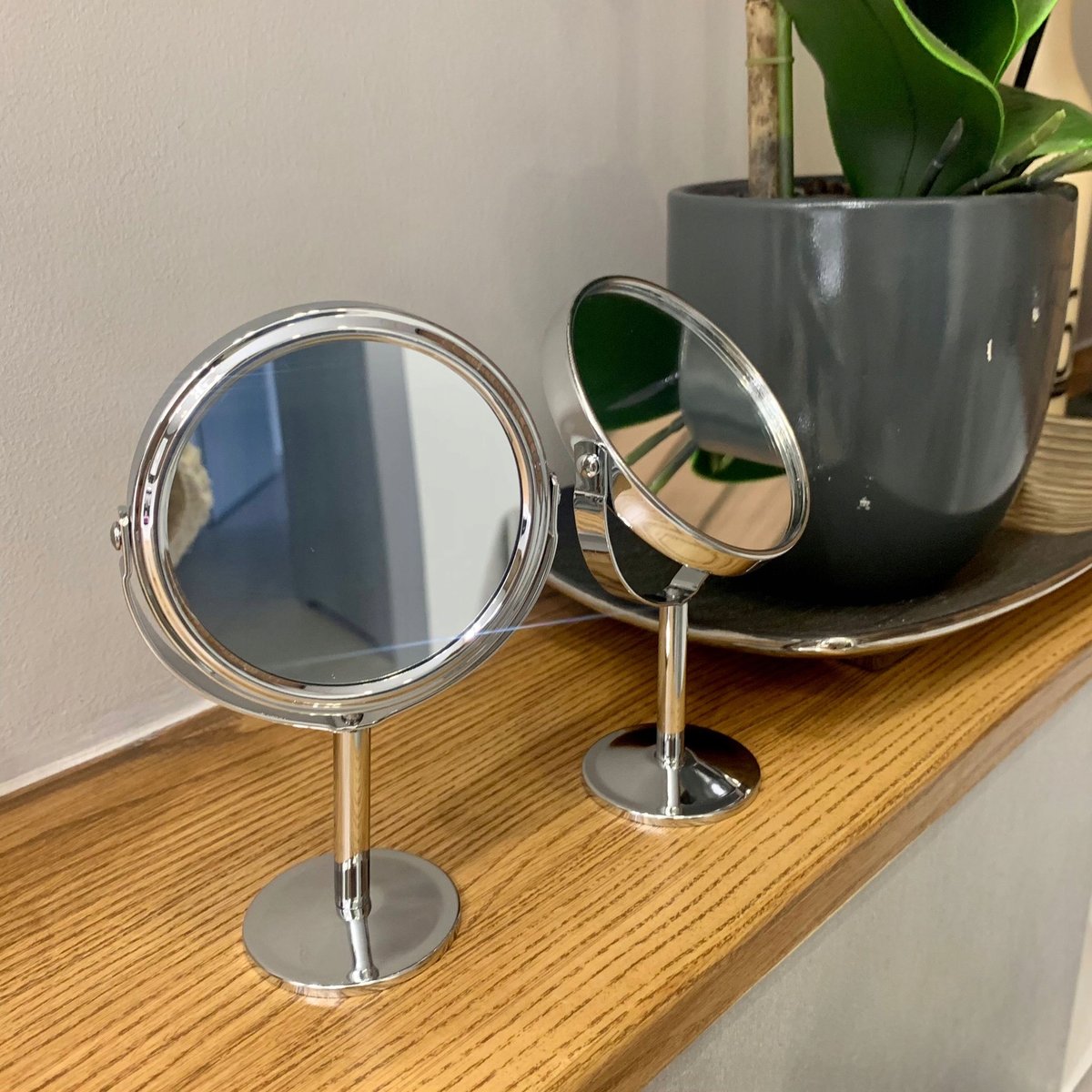LUSTERKO KOSMETYCZNE METALOWE OKRĄGŁE STOJĄCE Okrągłe lusterko w metalowej oprawiei na metalowej nóżce. Dwustronne – jedna strona z rozmiarem rzeczywistym, druga strona dwukrotnie powiększająca. ...