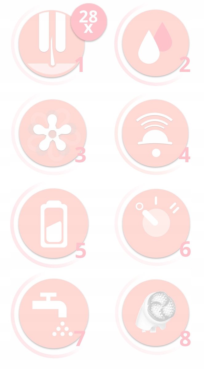 | Funkcje urządzenia: | czujnik kontaktu ze skórą, depilacja na mokro, masaż liftingujący, oświetlenie miejsca depilacji, regulacja prędkości |