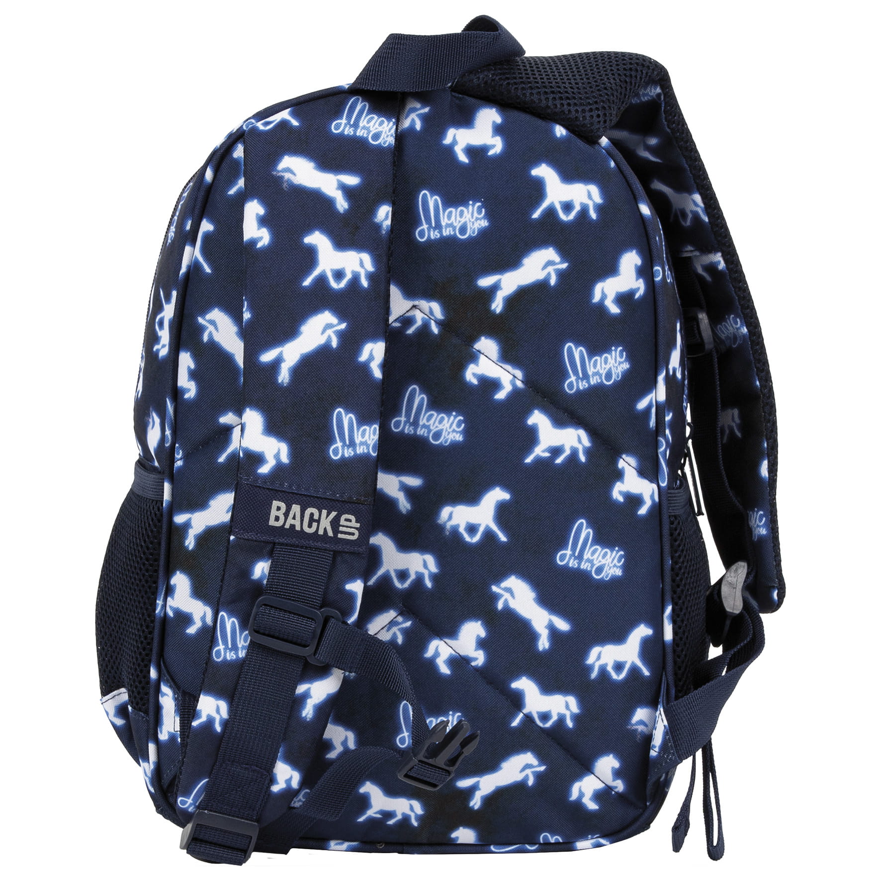 Niezwykłe połączenie granatowego materiału z bielą galopujących i skaczących koni stworzyło wyjątkowy efekt magicznego blasku. Sprawdzi się zarówno jako plecak na wycieczkę jak i do przedszkola lub do zerówki.