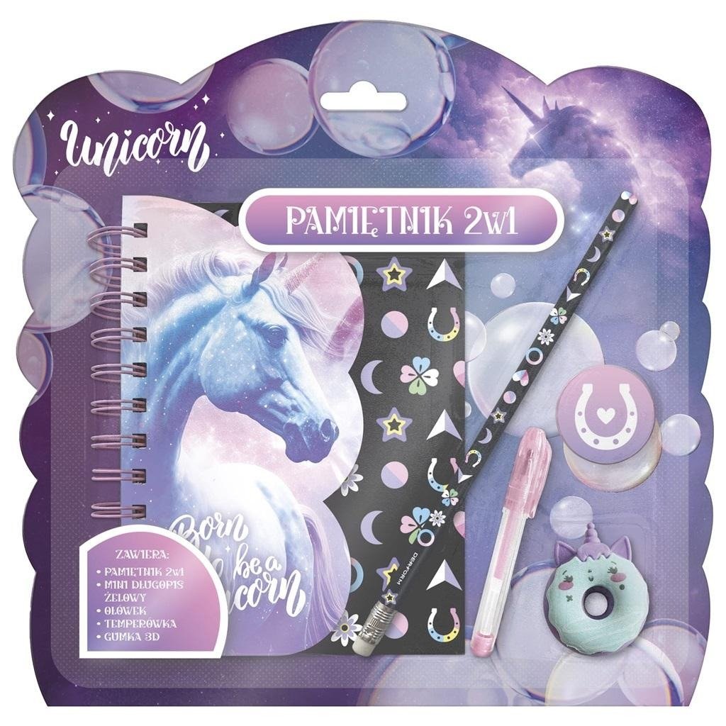 Pamiętnik Jednorożec 2w1 z kłódką z notesem ołówkiem gumką temperówką i mini długopisem żelowym Kidea.