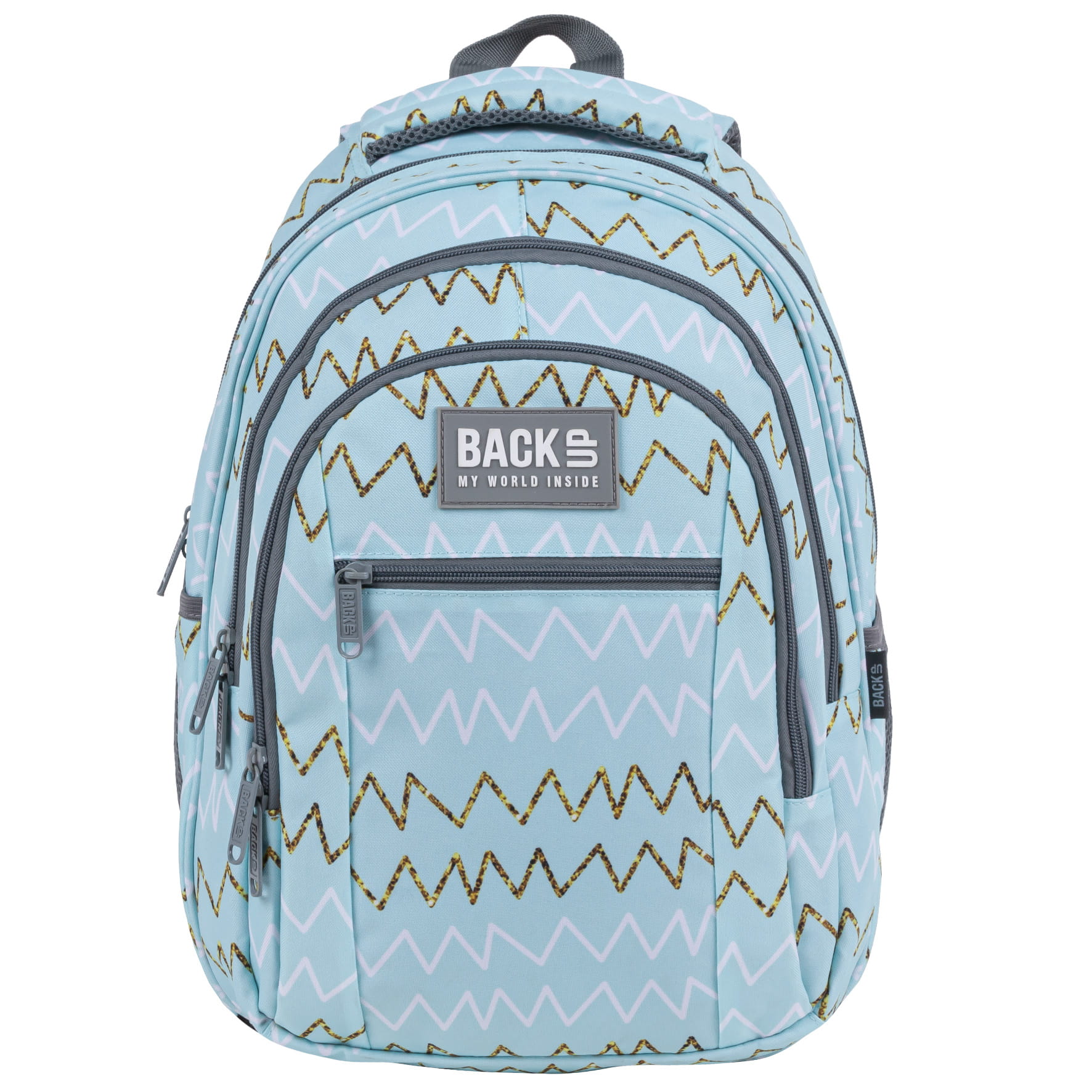 TRWAŁY I MODNY PLECAK SZKOLNY MŁODZIEŻOWEJ MARKI BACK UP W ZŁOTE ZYGZAKI NA TURKUSOWYM TLE