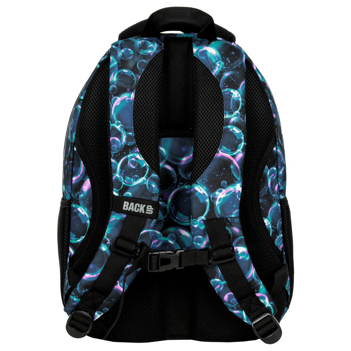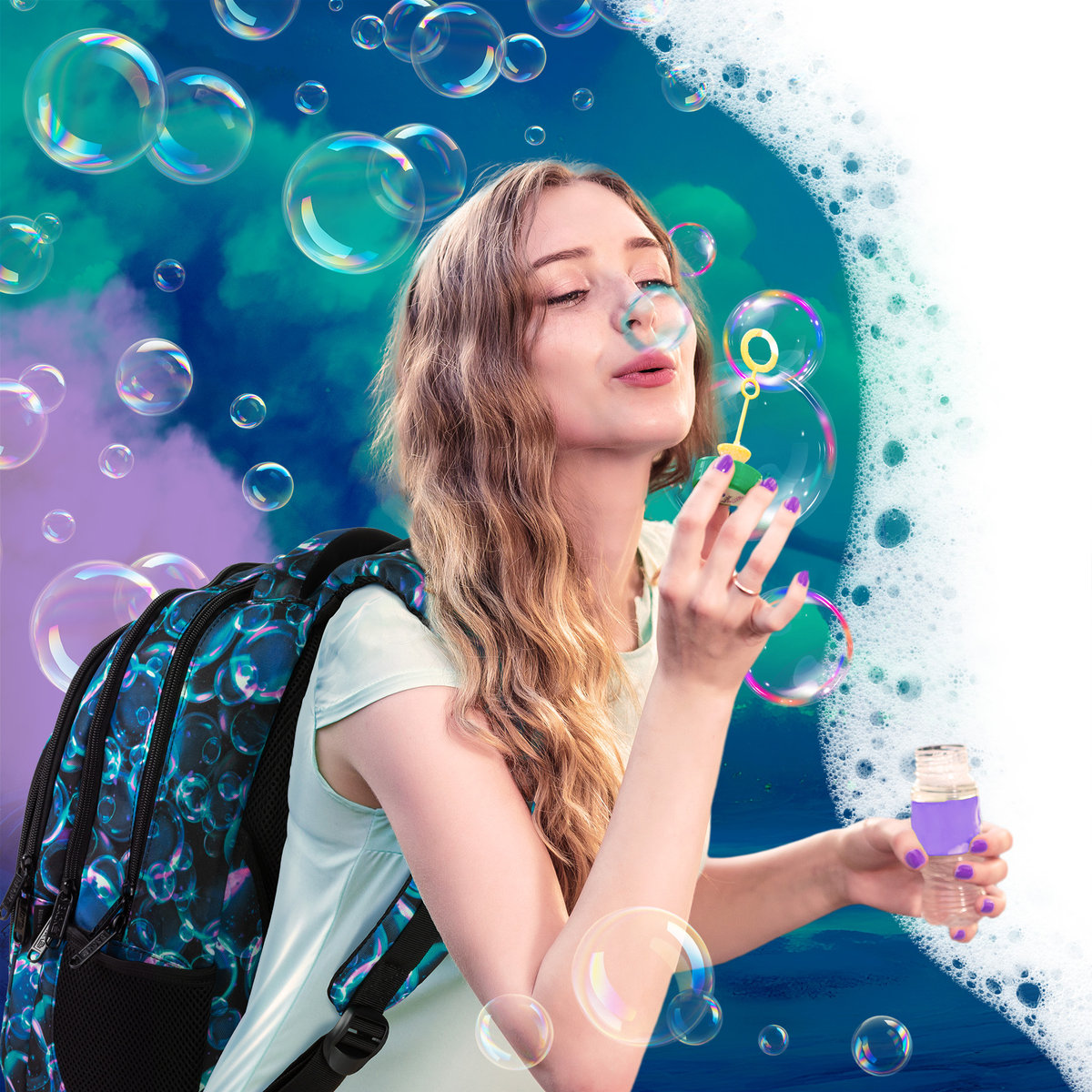Plecak szkolny, który zawarł w sobie esencje letnich dni i nocy, wypełnionych beztroską i zabawą. Wielobarwne, błyszczące bańki mydlane w odcieniach turkusu i fioletu dodają mu wyjątkowego uroku letnich wspomnień, zarazem przywodząc namyśl nocne niebo, pełne gwiazd i planet. Ten niezwykły wzór tworzy unikatowy plecak dla dziewczynki, która nie boi się zatracić w marzeniach.