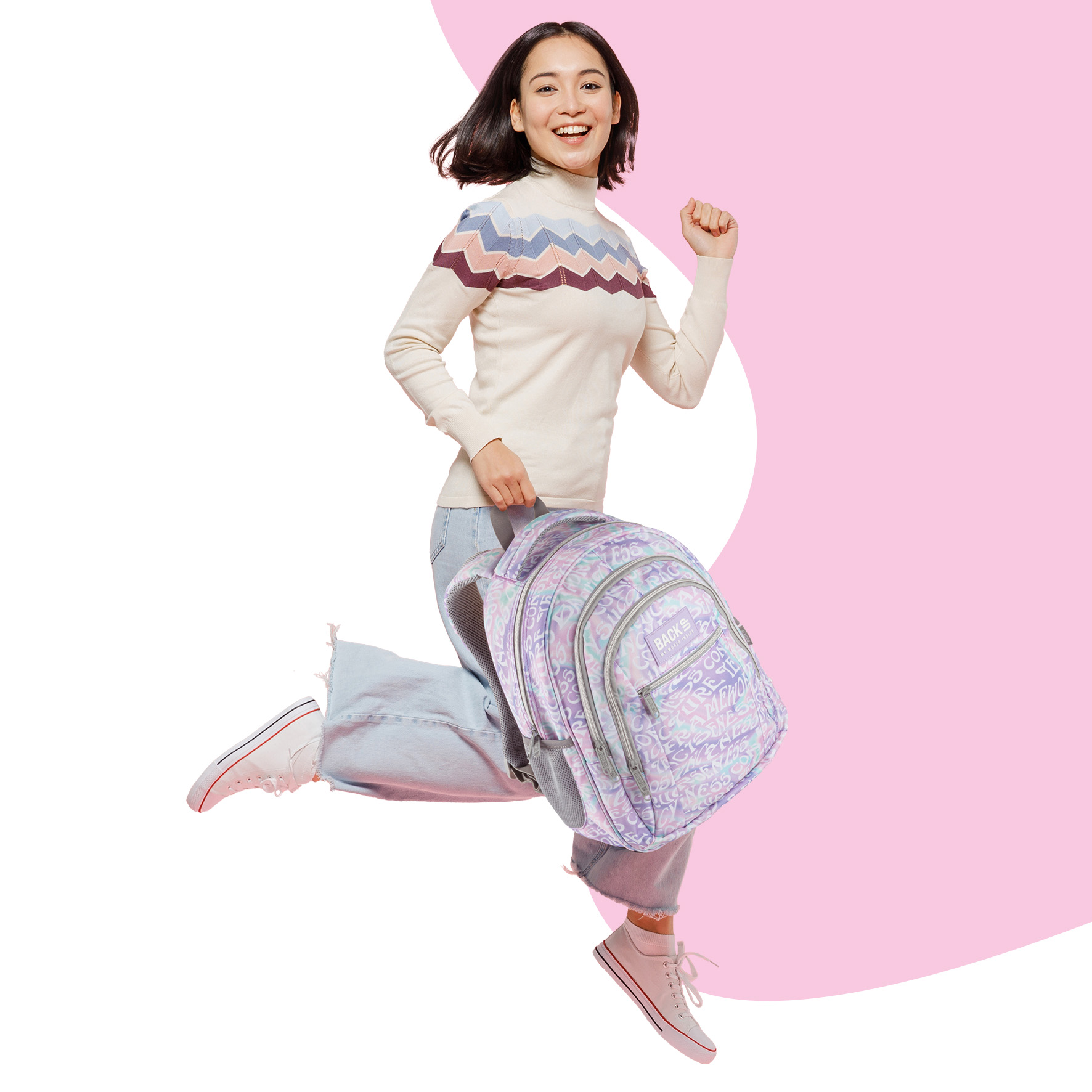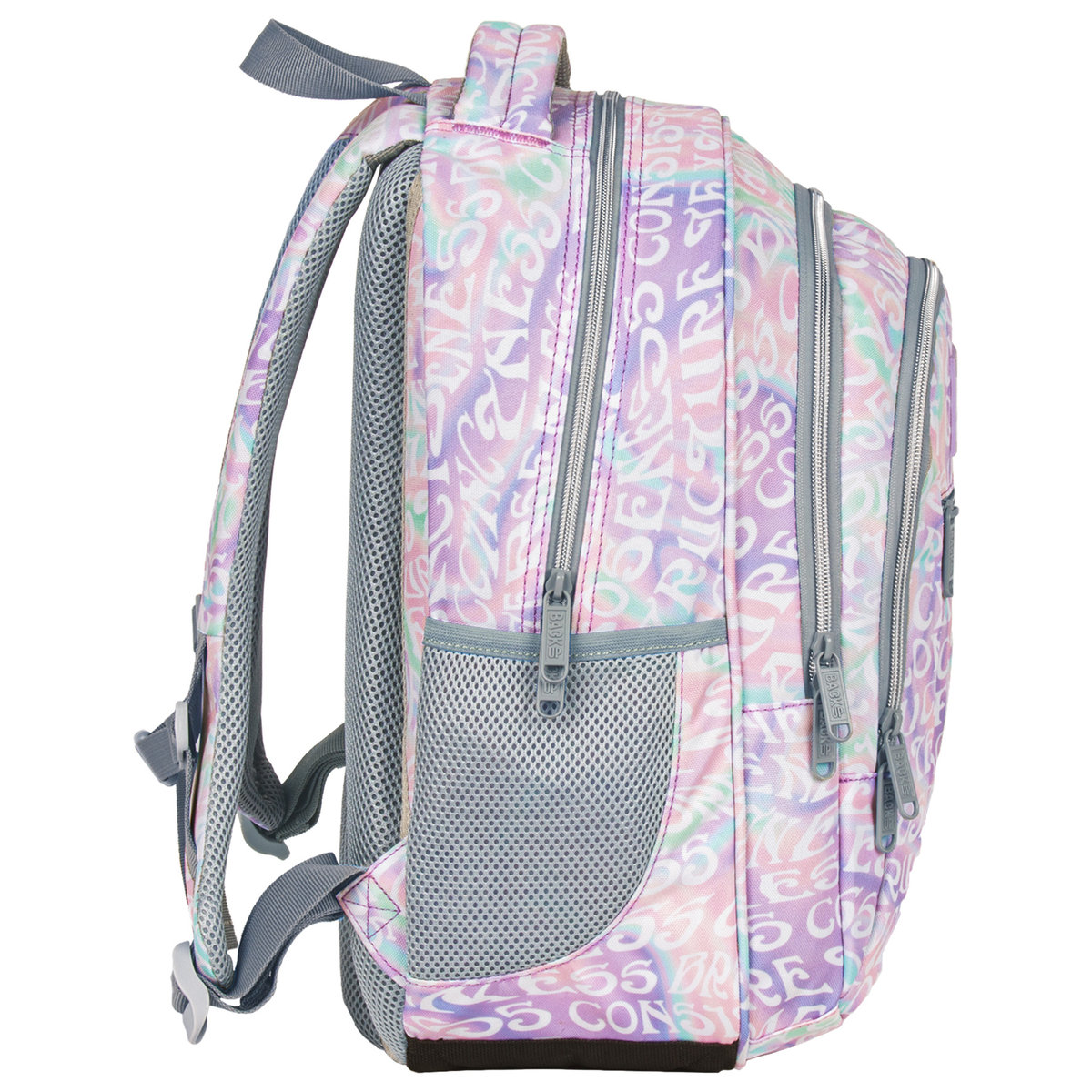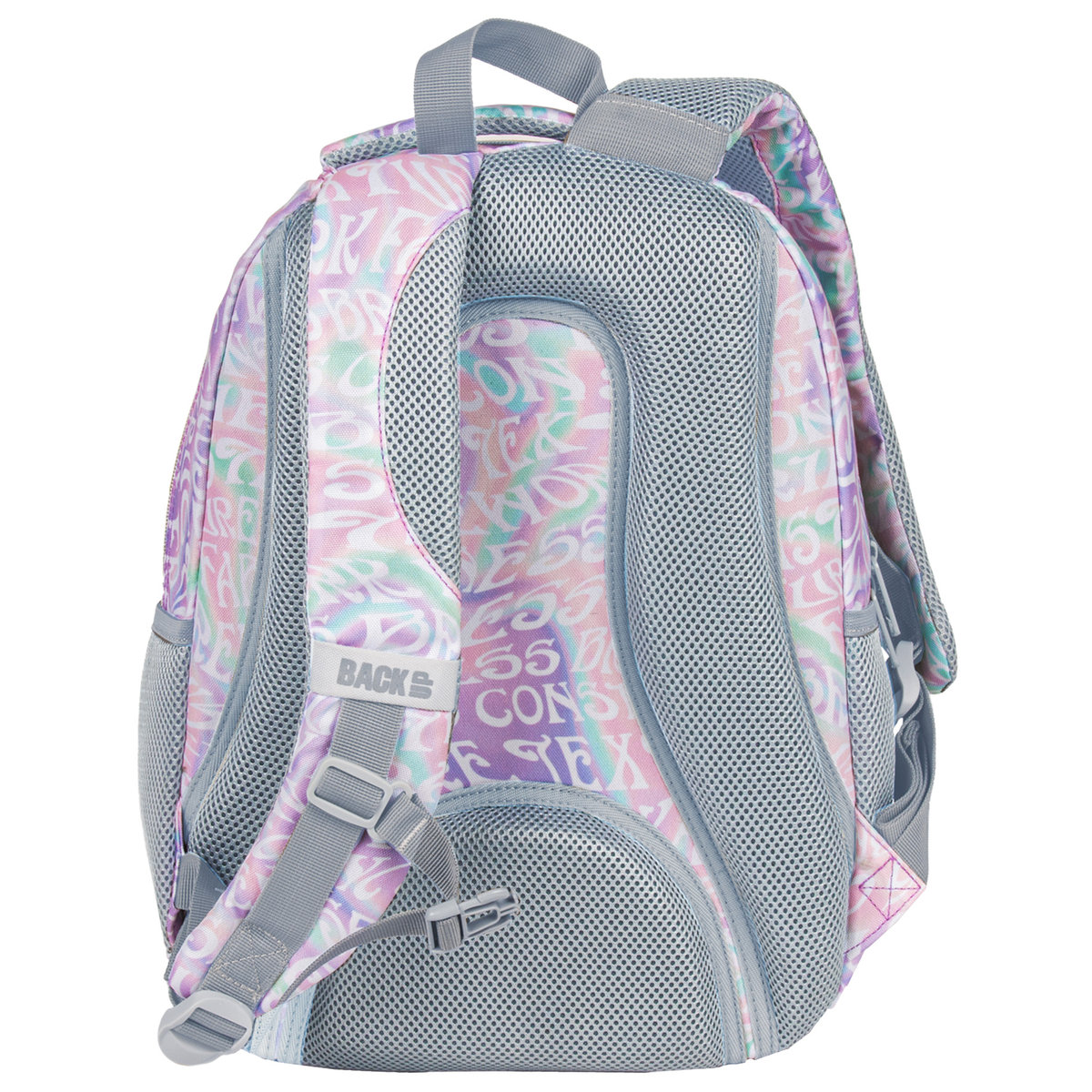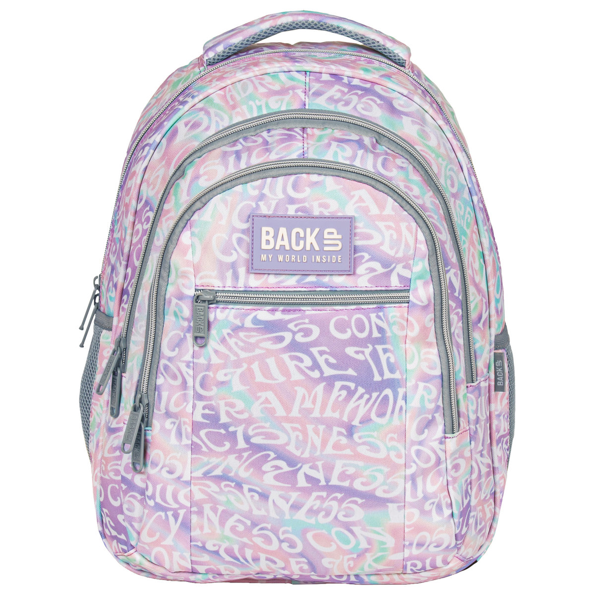 Plecak szkolny z nowej kolekcji Backup! Asymetryczna, biała czcionka zdobi zwariowane zawijasy kolorów na materiale, tworząc niezwykle młodzieżowy plecak.