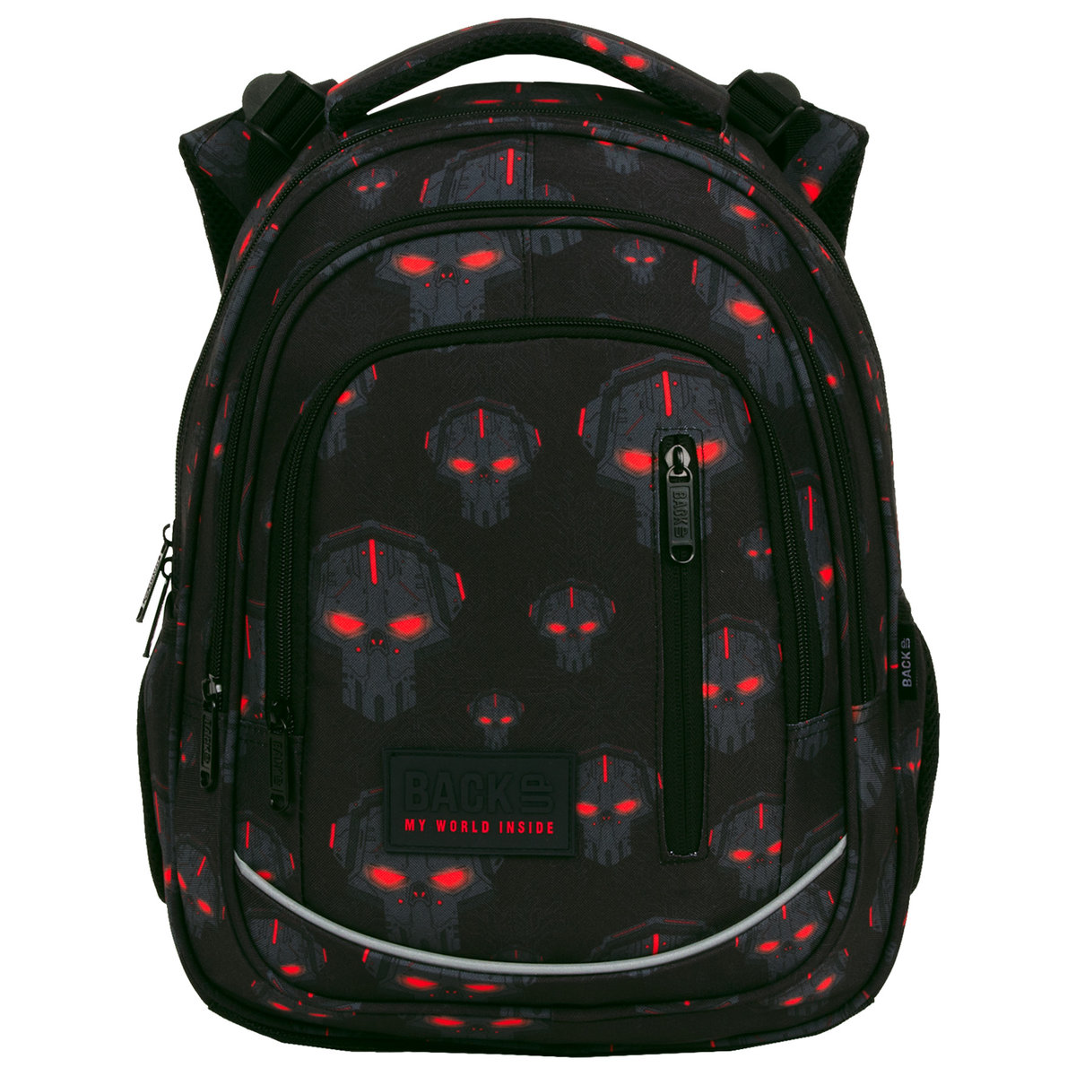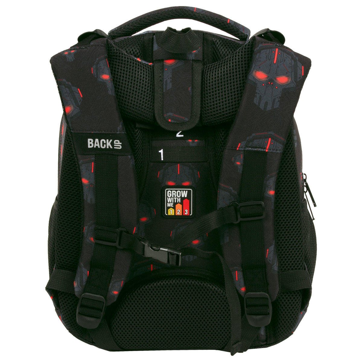 Plecak BackUP model R: - system „grow with me” z regulacją wysokości położenia szelek - trzystopniowy system nośny, dzięki któremu można dopasować plecak do wzrostu - 3 komory - 2 boczne kieszenie