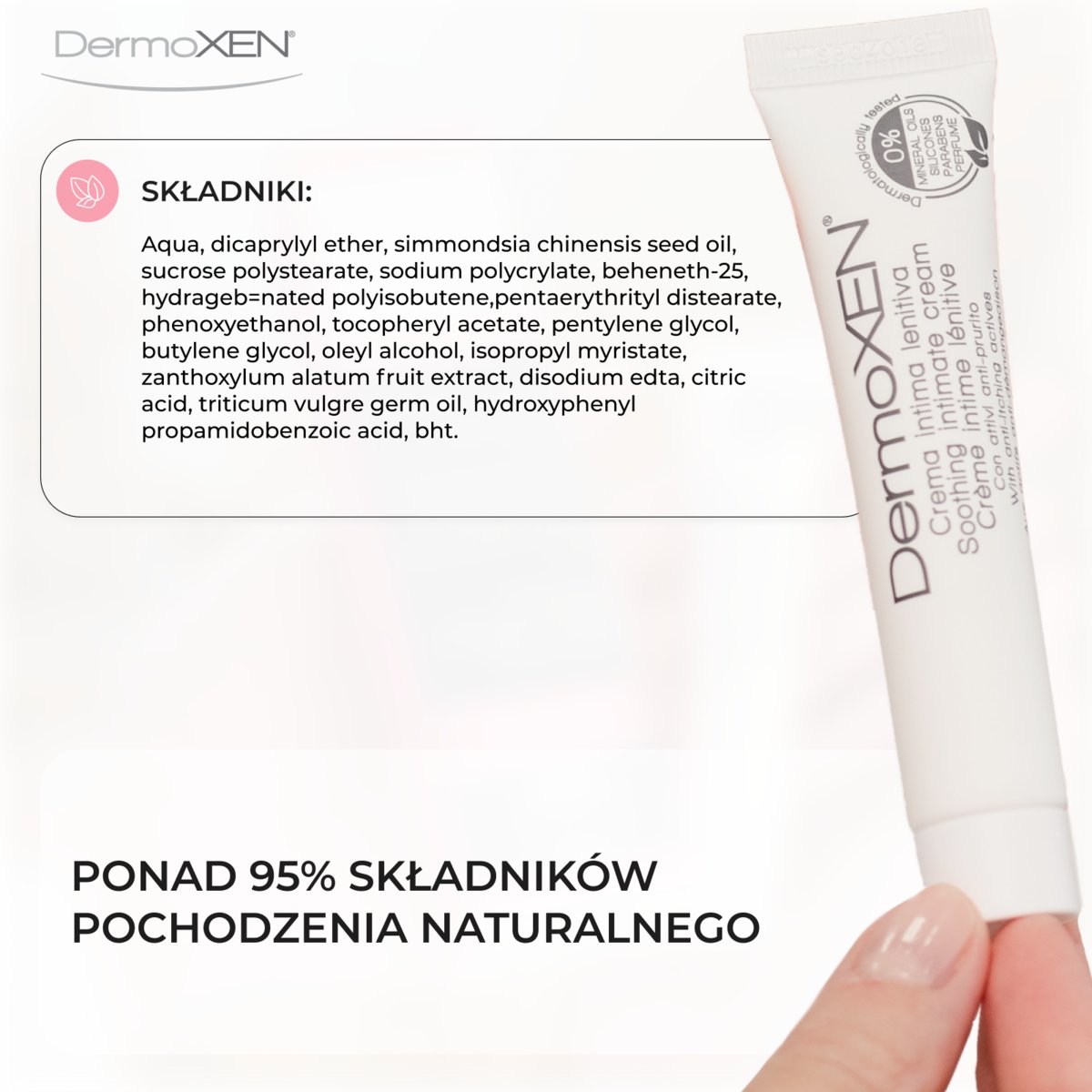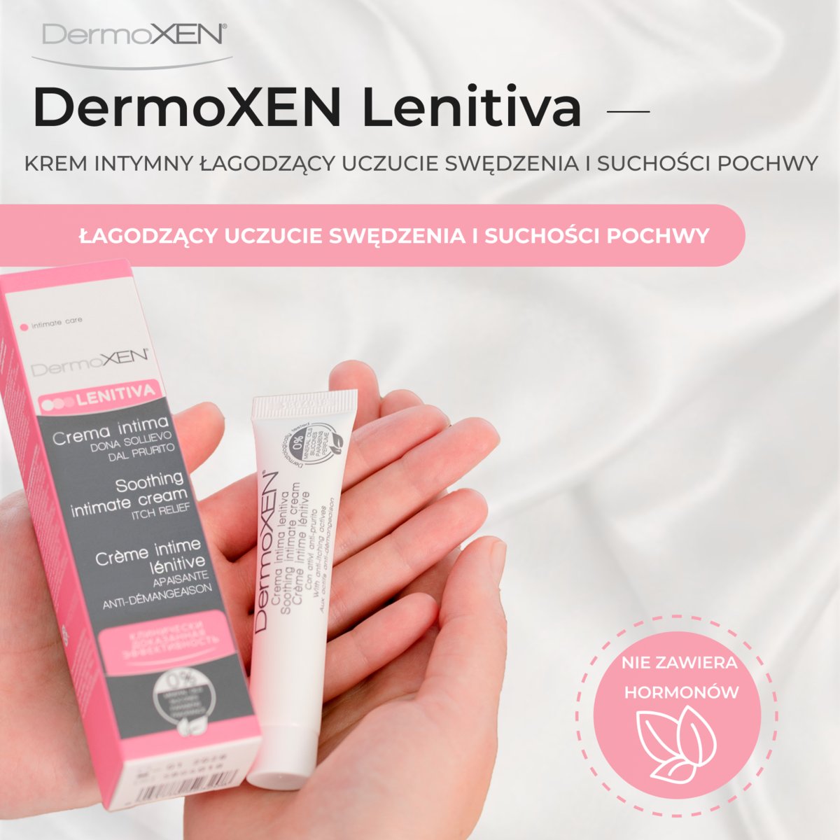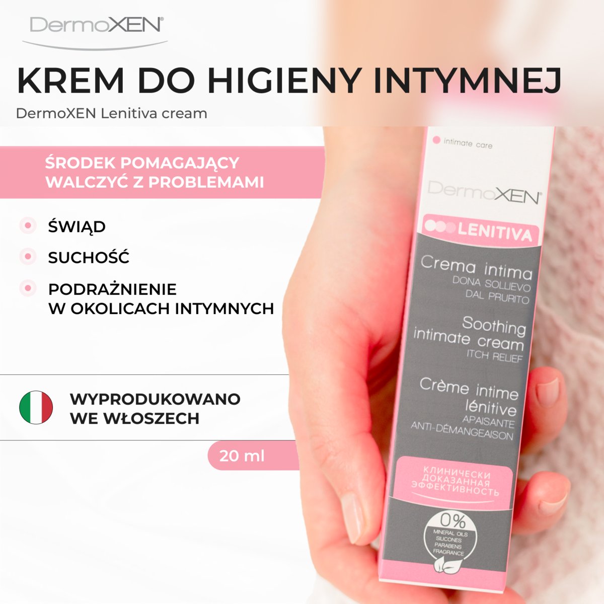 DermoXen Lenitiva Krem to produkt do higieny intymnej, który został stworzony z myślą o Twoim komforcie. To innowacyjny kosmetyk, którego formuła została opracowana przez ginekologów i dermatologów we Włoszech. Skutecznie łagodzi problemy związane z suchością, swędzeniem, stanem zapalnym, zaczerwienieniem oraz nieprzyjemnym zapachem w okolicy intymnej.