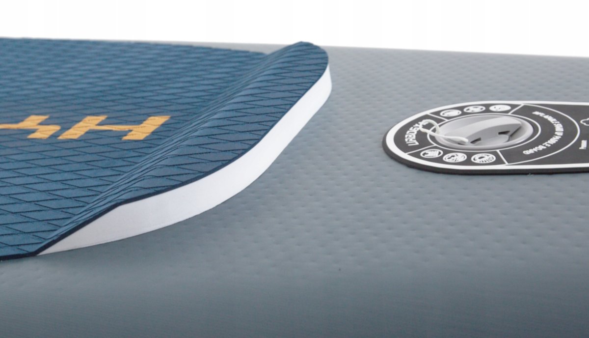 Pokład deski HYPERCANE 350 Urbogym pokryty jest wygodną i bardzo przyjemną w dotyku pianką EVA. Wykorzystany na nim diamentowy wzór zapewnia desce nie tylko ciekawy wygląd, ale również wyjątkową przyczepność i komfort dla osoby, która płynie na SUPie.