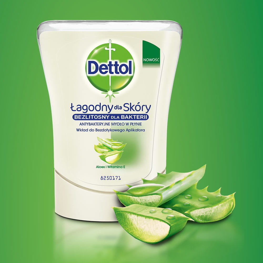 Dettol Aloe Vera to bezdotykowy dozownik mydła antybakteryjnego w płynie w komplecie z wkładem. Zabija 99,9% bakterii. Gwarancja ochrony delikatnej skóry dłoni. Na bazie naturalnych składników. O niezwykle przyjemnym zapachu.