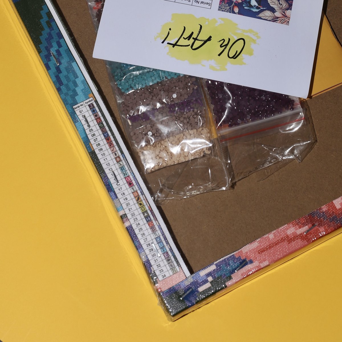 Otwórz opakowanie, sprawdź czy zawiera wszystkie narzędzia oraz czy kolory kryształków są odpowiednie do obrazu znajdującego na płótnie.
