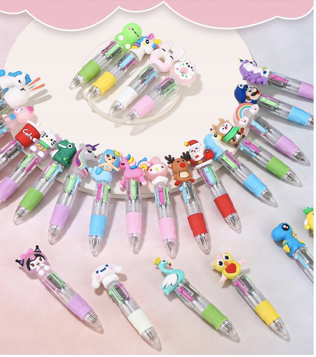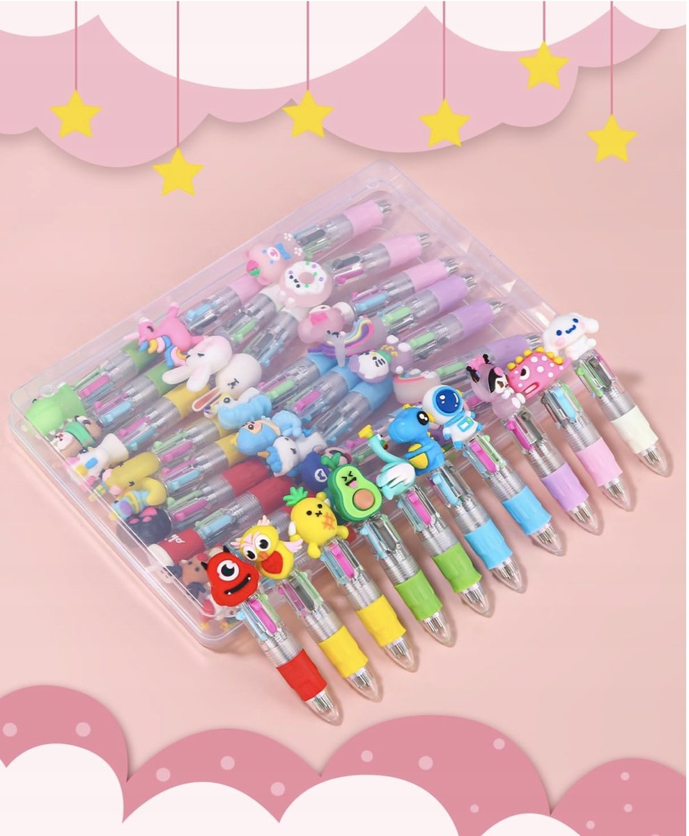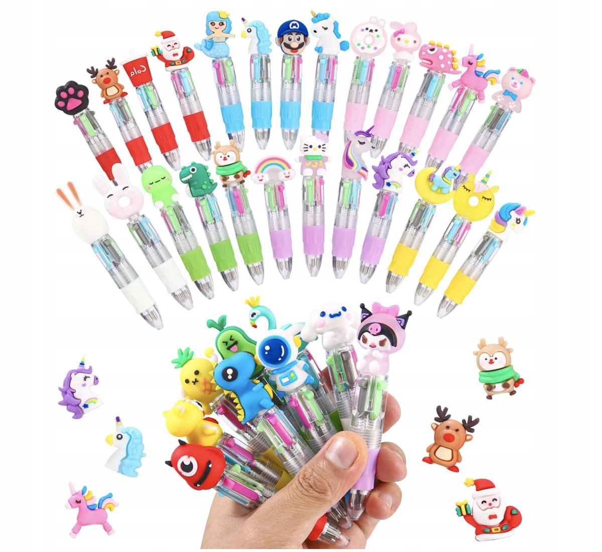 ➡️ 34 wyjątkowe długopisy 4 w 1 w intensywnych barwach: czerwonej, zielonej, niebieskiej i czarnej. Każdy ma zabawną, zwierzęcą czapeczkę – od dinozaura po jednorożca – które zachwycą małych artystów i pobudzą wyobraźnię podczas rysowania i pisania.