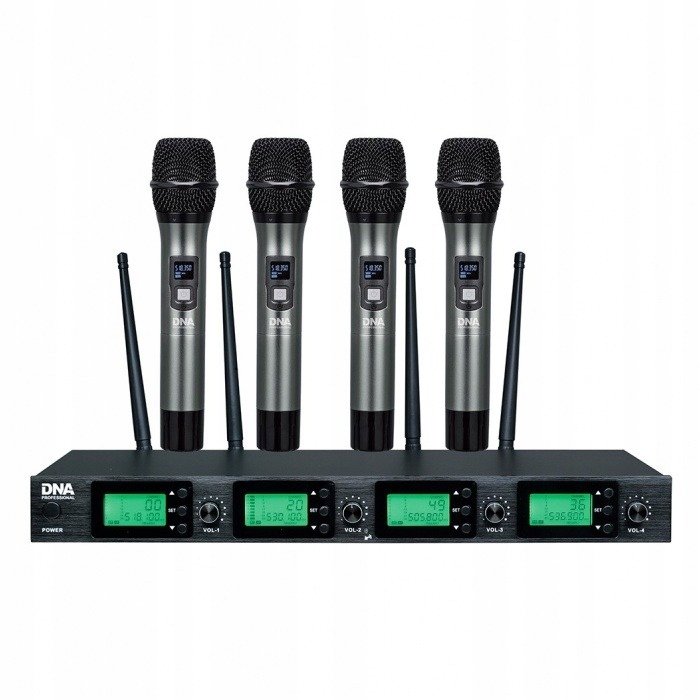 Zestaw Mikrofonów Bezprzewodowych - 4 Sztuki - DNA RV-4 ➡️ DNA RV-4 to profesjonalny, bezprzewodowy zestaw mikrofonowy, w którego skład wchodzą cztery mikrofony doręczne oraz odbiornik fal radiowych ...