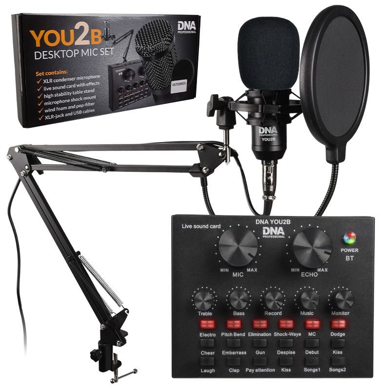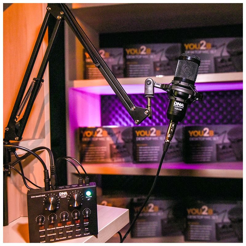 DNA YOU2B to bardzo dobry zestaw do nagrywania dźwięku na komputerze oraz różnego typu realizacji live. Doskonale sprawdza się podczas nagrywania podcastów, streamów, tekstów lektorskich, treści na portale społecznościowe, a także wokalu i różnego typu instrumentów akustycznych. W komplecie znajduje się mikrofon pojemnościowy, antywstrząsowy uchwyt mikrofonowy, dwa filtry redukujące szumy, ramię wysięgnikowe umożliwiające łatwą instalację i pracę z mikrofonem, a także przenośny zewnętrzny interfejs audio z możliwością bezprzewodowej pracy na akumulatorze posiadający dodatkowo wbudowane efekty dźwiękowe (np. śmiech, oklaski publiczności), dzięki czemu YOY2B doskonale sprawdza się także jako narzędzie pracy mobilnych DJ-ów.