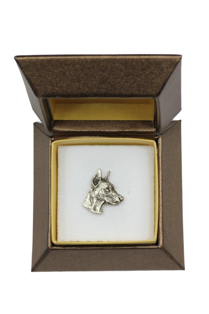 Doberman, Dobermann I - broszka z psem w pudełku prezentowym, elegancki pin, wpinka do klapy marynarki marki Art-Dog Przedstawiamy wyjątkowy upominek dla każdego psiarza - elegancka, posrebrzana ...