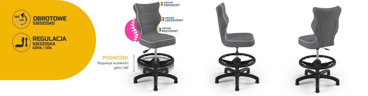 | Nazwa: | Entelo, Krzesło do biurka dla dziecka dopasowane do wzrostu 133-159 cm, model Petit z podnóżkiem kolor ciemny szary obrotowe |
