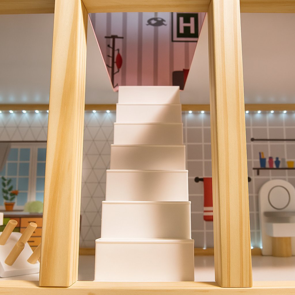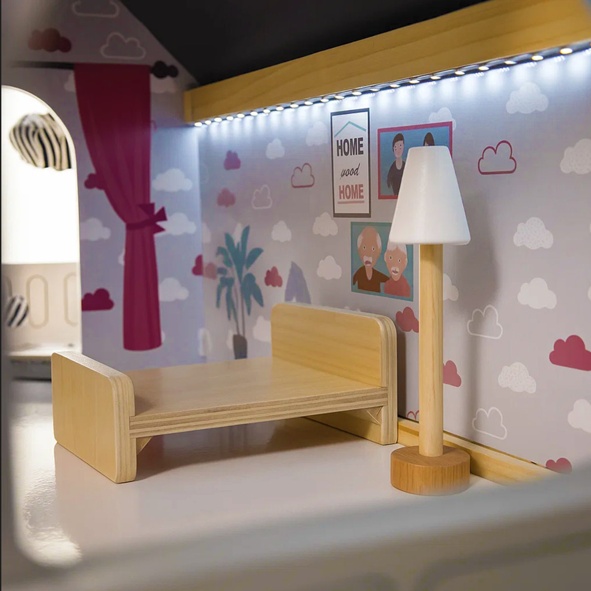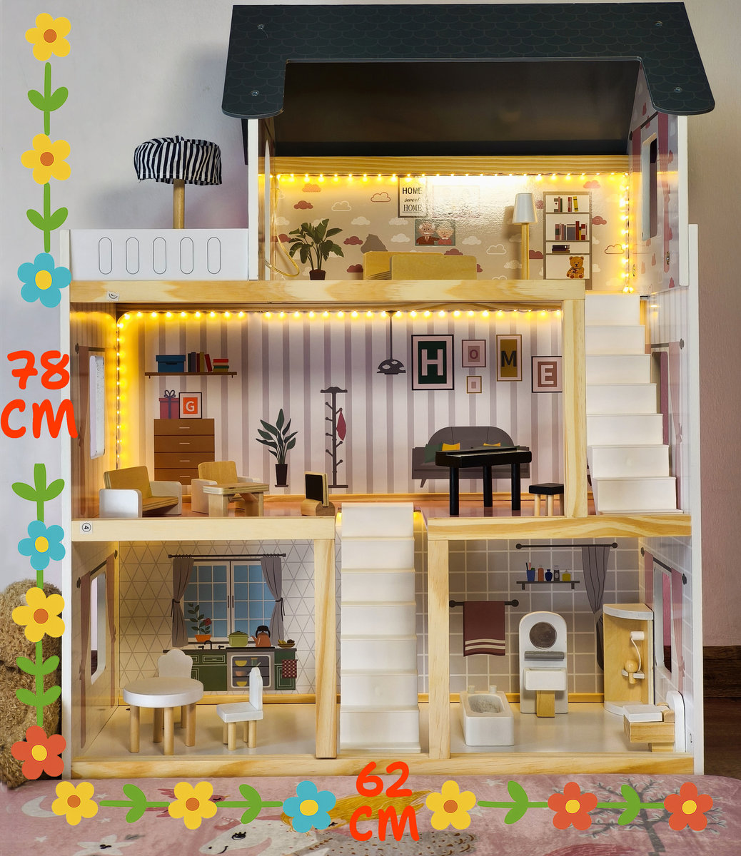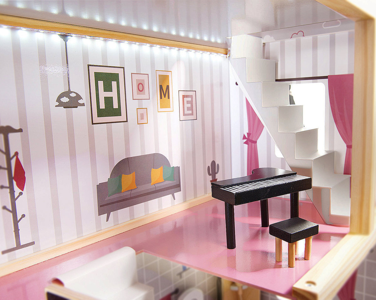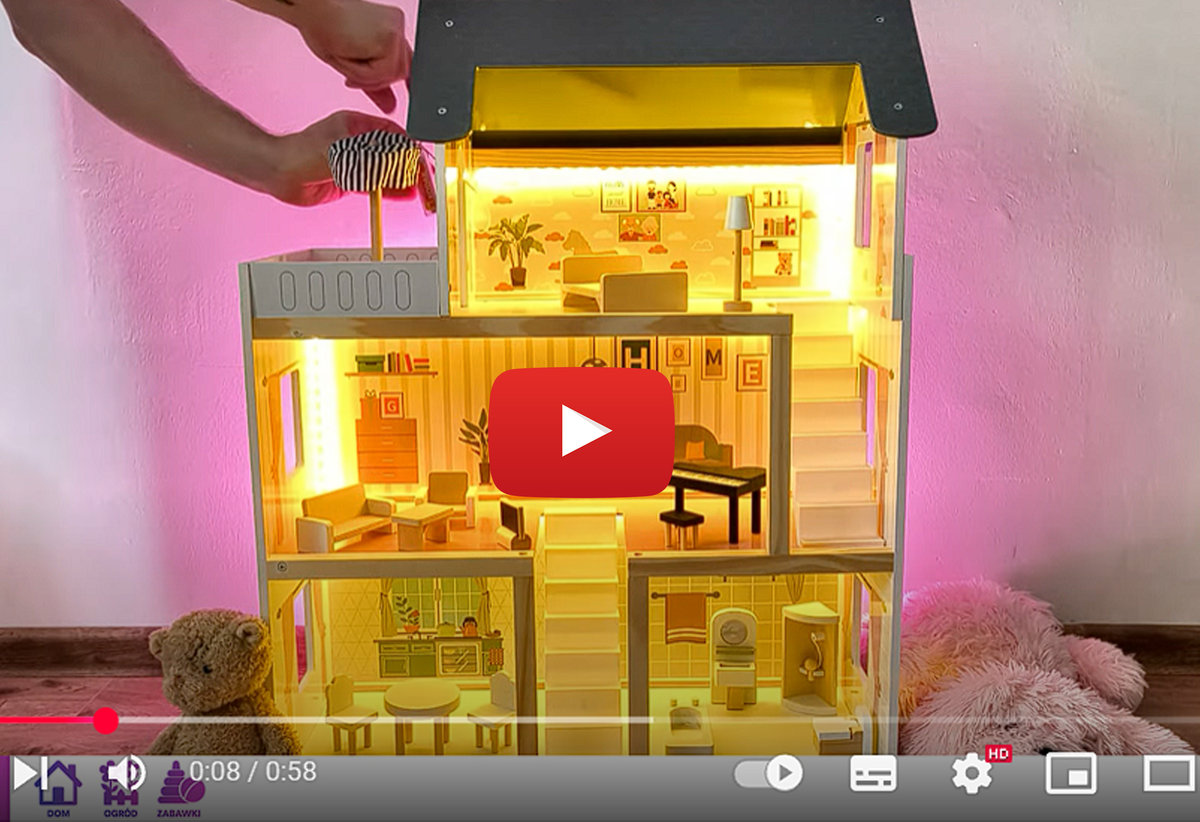 Przedstawiamy nowoczesny, piętrowy domek dla lalek z oświetleniem LED i pełnym zestawem mebelków. To nie tylko źródło niekończącej się zabawy, ale również piękna dekoracja do dziecięcego pokoju!