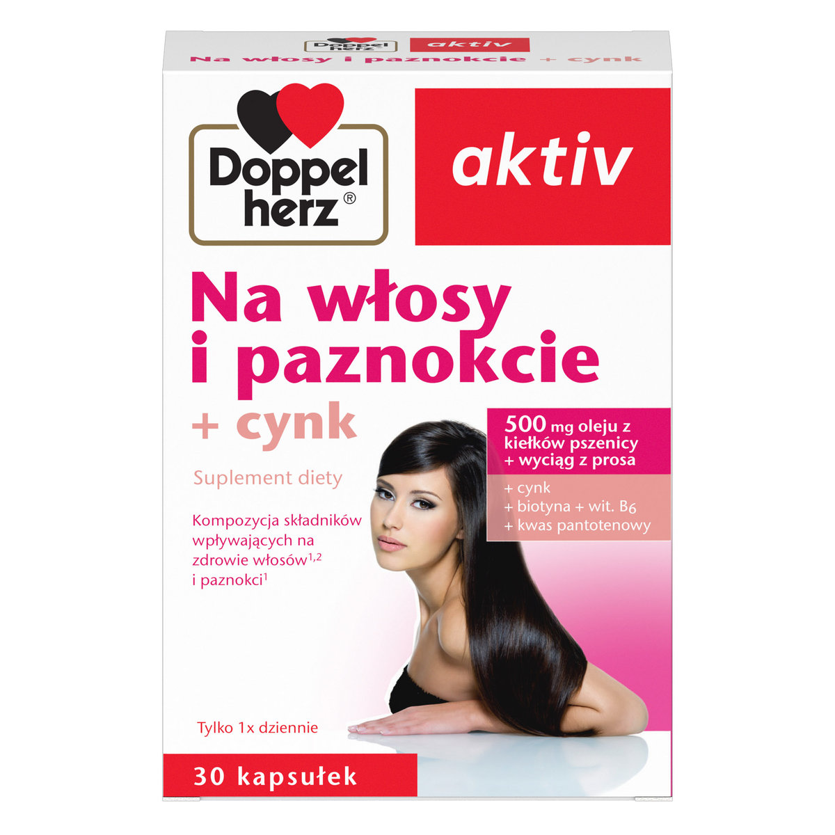 Doppelherz aktiv Na włosy i paznokcie + cynk SUPLEMENT DIETY, 30 kapsułek Kompozycja składników wpływających na zdrowie włosów (cynk, biotyna) i paznokci (cynk). Wspiera wygląd włosów i paznokci ...