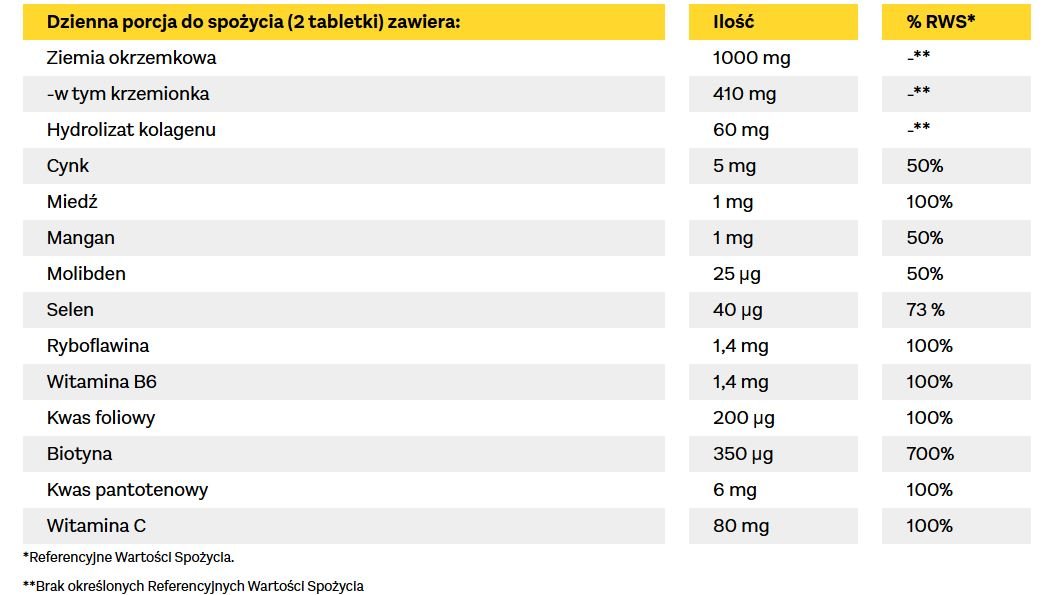- Nowość! aż 410 mg krzemionki oraz 350 µg biotyny i kolagen w dziennej porcji!