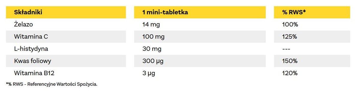 14 mg żelaza, witamina C, aminokwas L-histydyna, witaminy z grupy B: kwas foliowy oraz witamina B12 w łatwej do połknięcia mini-tabletce,