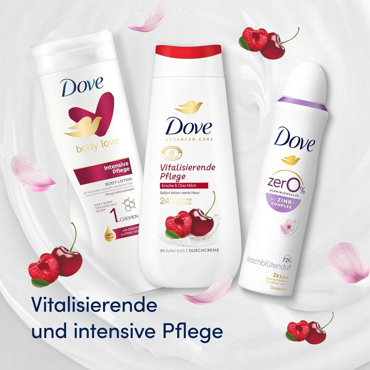 Krem pod prysznic Dove o witalizującej formule, który zawiera mleko wiśniowe i nasiona chia, zapewniający 24-godzinną hidratację dla delikatnej skóry.