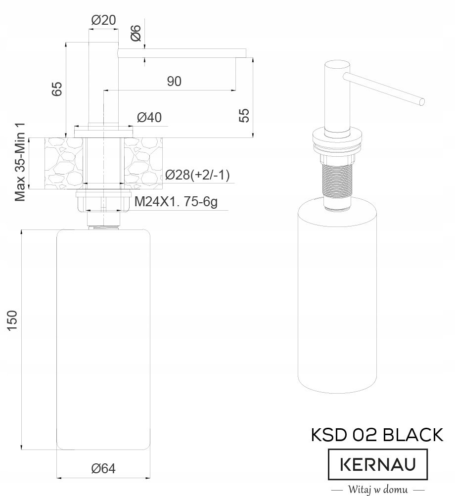 Dozownik na płyn do naczyń Kernau KSD 02 o wysokości 280 mm i zasięgu wylewki 90 mm dostępny jest w kolorze Chrome oraz Matt Black. Jego uzupełnianie jest bardzo wygodne dla użytkownika, ponieważ odbywa się od góry. Można montować go zarówno w zlewozmywaku, jak i w blacie kuchennym. Dozownik nadaje się do blatu o maksymalnej grubości 35 mm. Świetnie pasuje kolorystycznie do czarnych zlewów i baterii. To doskonały wybór dla osób dbających o każdy szczegół wystroju wnętrza. Dzięki niemu unikniemy trzymania na blacie nieestetycznych butelek z płynem do naczyń, a dzięki dużej pojemności nie będzie potrzeby ciągłego uzupełniania go.