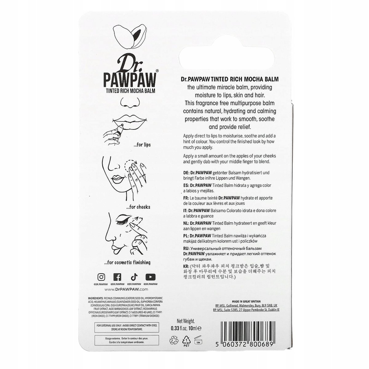 - Balsam do ust Dr.PAWPAW Tinted Rich Mocha można stosować na różne sposoby na ustach, policzkach i powiekach. Natychmiast rozjaśnij swoją cerę dzięki temu kolorowi, który można zbudować, idealnie do rozwiązania i wieczornych rozkładów