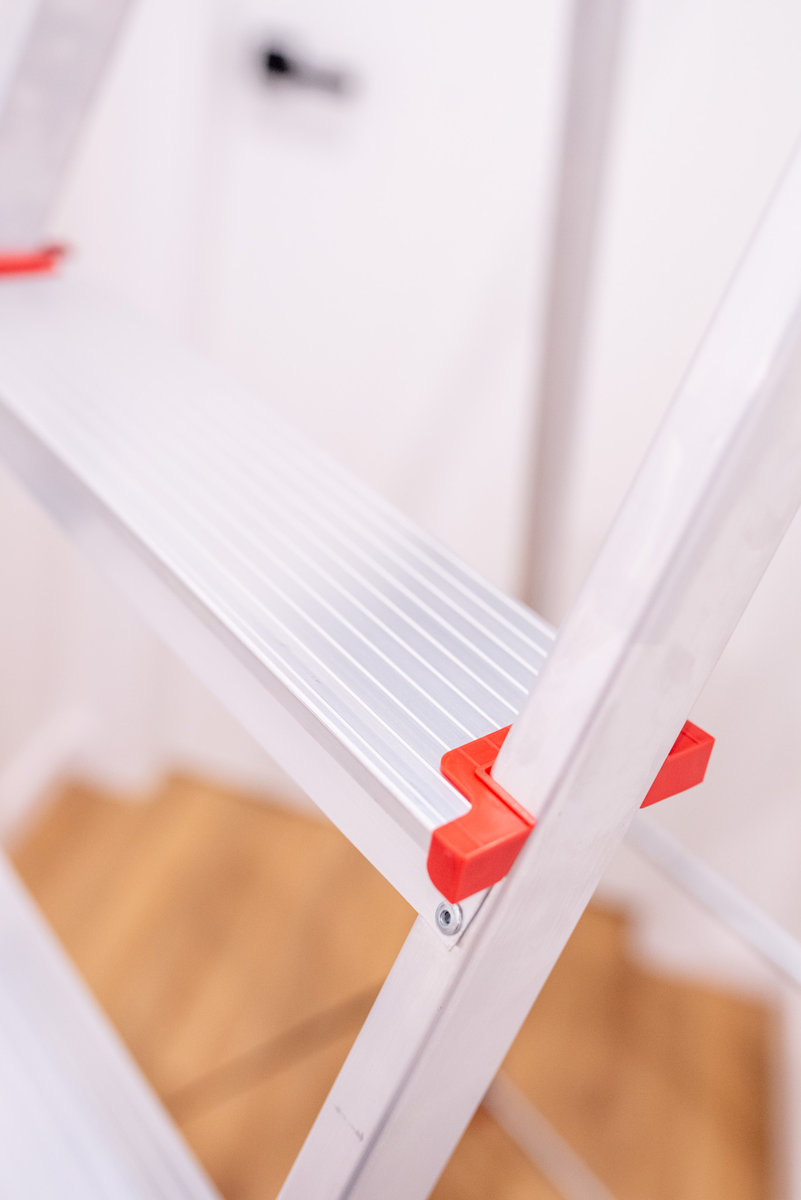 Składana konstrukcja – drabina zajmuje niewiele miejsca po złożeniu, co ułatwia przechowywanie.