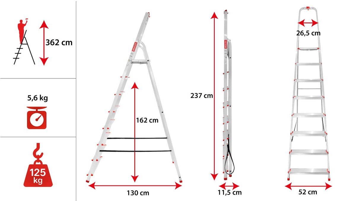 Ta 8-stopniowa składana drabina aluminiowa to idealne rozwiązanie do domu, garażu, warsztatu czy ogrodu. Mimo większego zasięgu roboczego, pozostaje lekka, poręczna i łatwa do przechowywania, co czyni ją praktycznym narzędziem w każdej sytuacji.