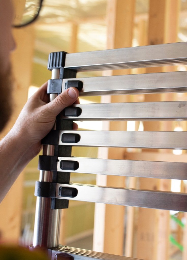 Zaawansowany mechanizm teleskopowy umożliwia łatwe rozkładanie i składanie drabiny. Dzięki płynnie działającym sekcjom, każda część blokuje się stabilnie, zapewniając bezpieczeństwo użytkowania.