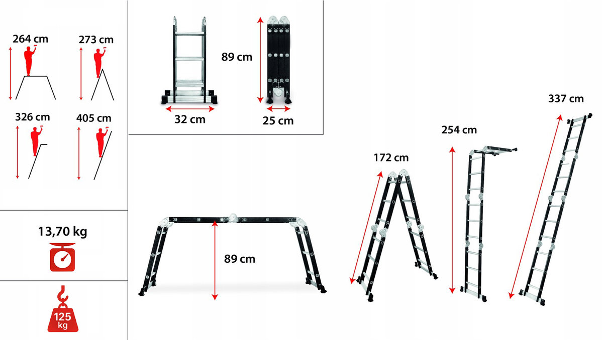 Wysokość robocza naszej drabiny uniwersalnej określa maksymalną wysokość, którą można osiągnąć, gdy drabina jest w pełni rozłożona i stabilnie zabezpieczona.