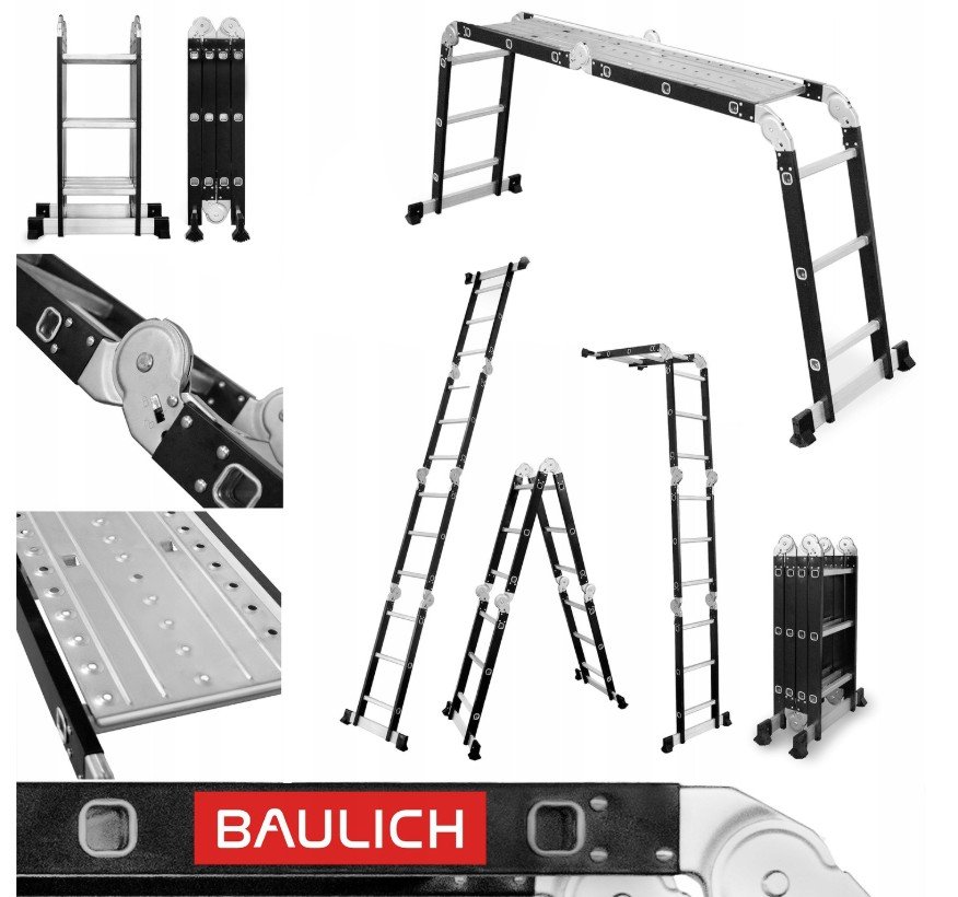 | Nazwa: | Drabina uniwersalna przegubowa wielofunkcyjna składana z podestem 4x3 BAULICH |