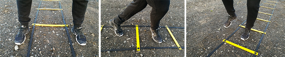 - Dwie stopy bokiem Skacz na obu stopach bokiem przez drabinkę. Trzymaj biodra i ramiona pod kontem 90 stopniu do kierunku ruchu. Wykonuj skoki raz w lewo raz w prawo.