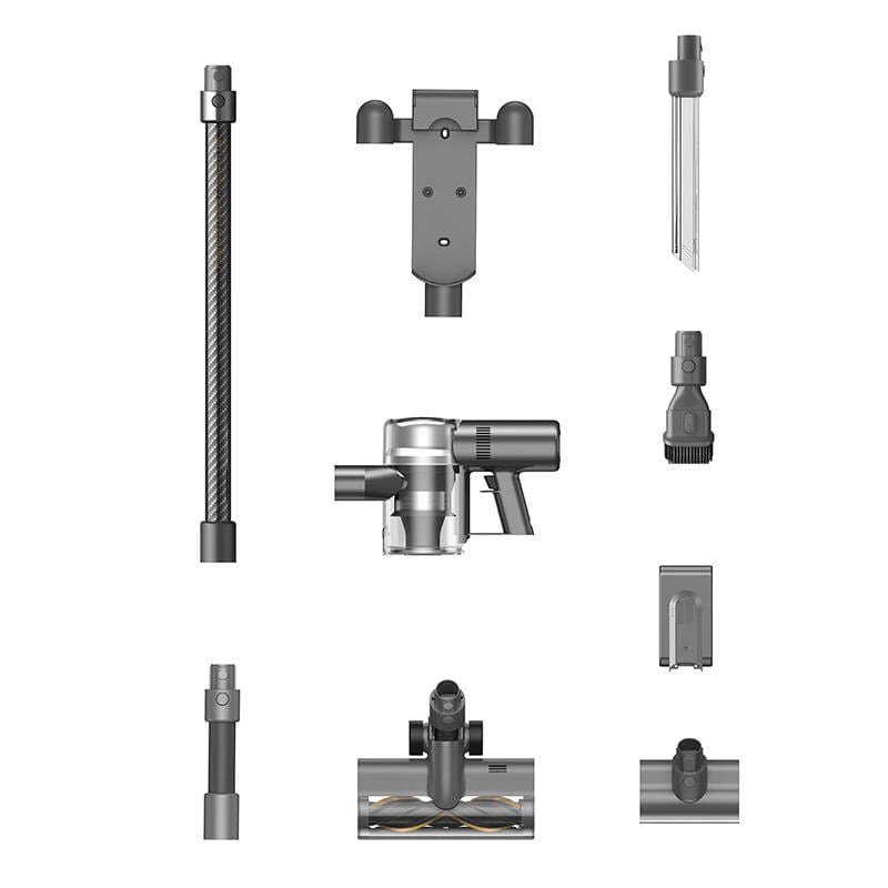 Zawartość opakowania: Pręt z włókna węglowego, Szczotka do kurzu x 1, Ssawka szczelinowa x 1, Adapter x 1, Elastyczna rura x 1, Szczotka 2w1 x 1, Uchwyt ścienny x 1, Elektroszczotka x 1, Szczotka główna x 1, Odkurzacz x 1, Ładowarka x 1