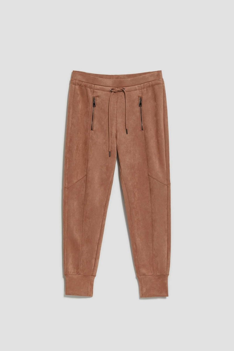 95%POLIESTER, 5%ELASTAN. Spodnie dresowe z materiału imitującego zamsz. Na przedzie widoczne ozdobne szwy, nadające lekko elegancki charakter. W pasie sznurek regulujący szerokośc w pasie. Kieszenie zapinane na zamek. Nogawki zakończone szerokim ściągaczem.
