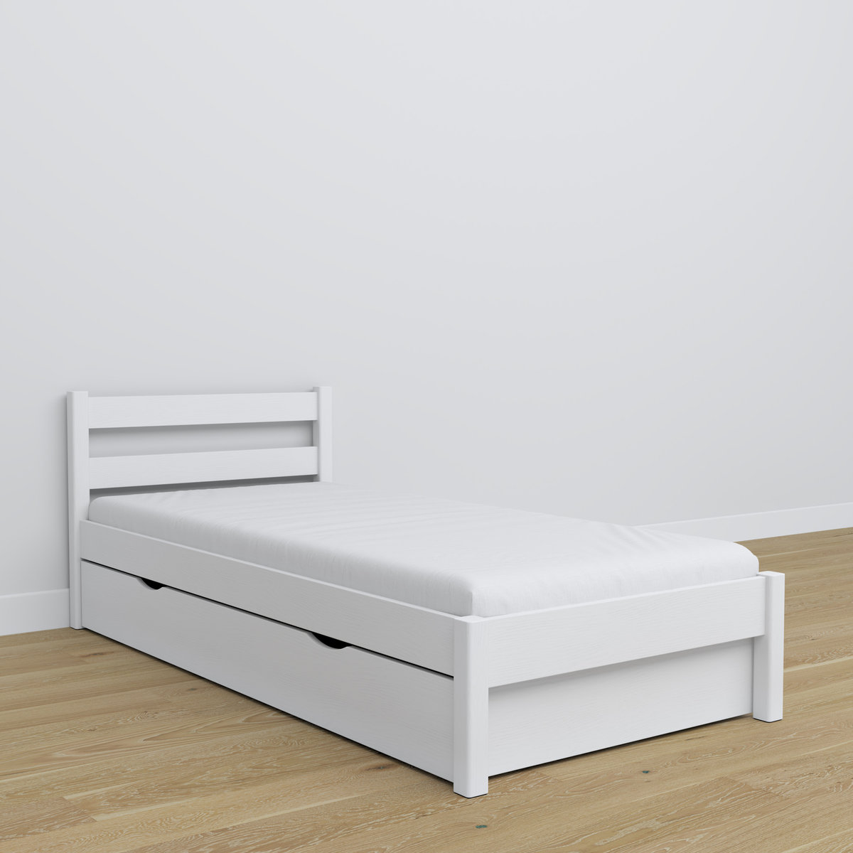 Drewniane łóżko N01 w kolorze białym wyposażone w praktyczną i pojemną szufladę, to nie tylko wyjątkowo wysokiej jakości mebel, lecz także dzieło rzemiosła, które gwarantuje nie tylko komfort, ale także elegancję w jednym. Każdy szczegół tego łóżka został precyzyjnie wykonany, aby stworzyć niepowtarzalny i trwały element Twojej sypialni. Jego prosty a zarazem elegancki design doskonale uzupełni każdą aranżację. Solidna konstrukcja, oparta na nogach o wymiarach 5,7 x 5,7 cm oraz perfekcyjne dopasowanie wszystkich elementów, gwarantują stabilność na najwyższym poziomie. Maksymalny udźwig wynoszący aż 200 kg sprawia, że łóżko N-Wood stanowi bezpieczne rozwiązanie zarówno dla dzieci, jak i dorosłych.