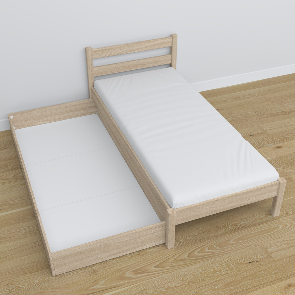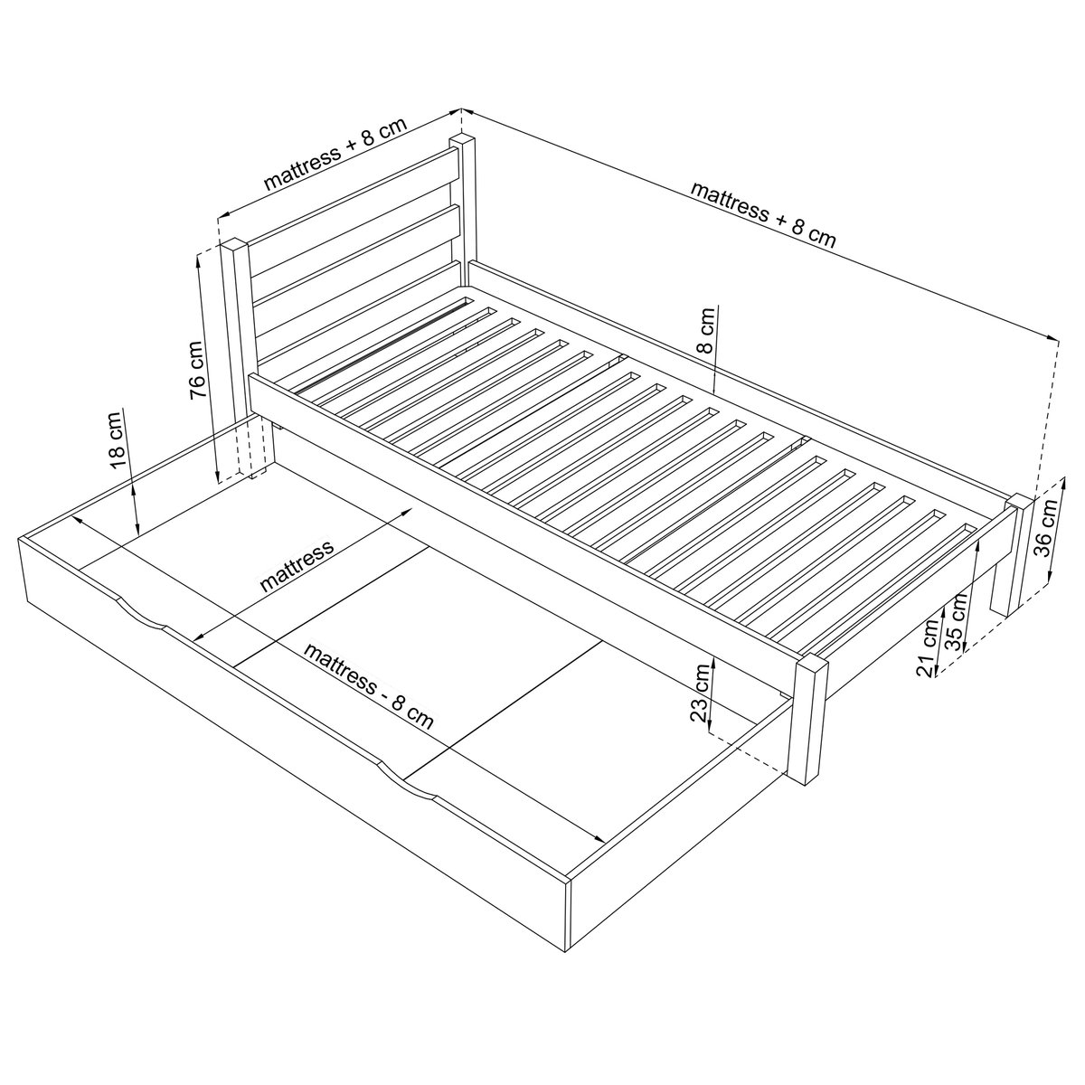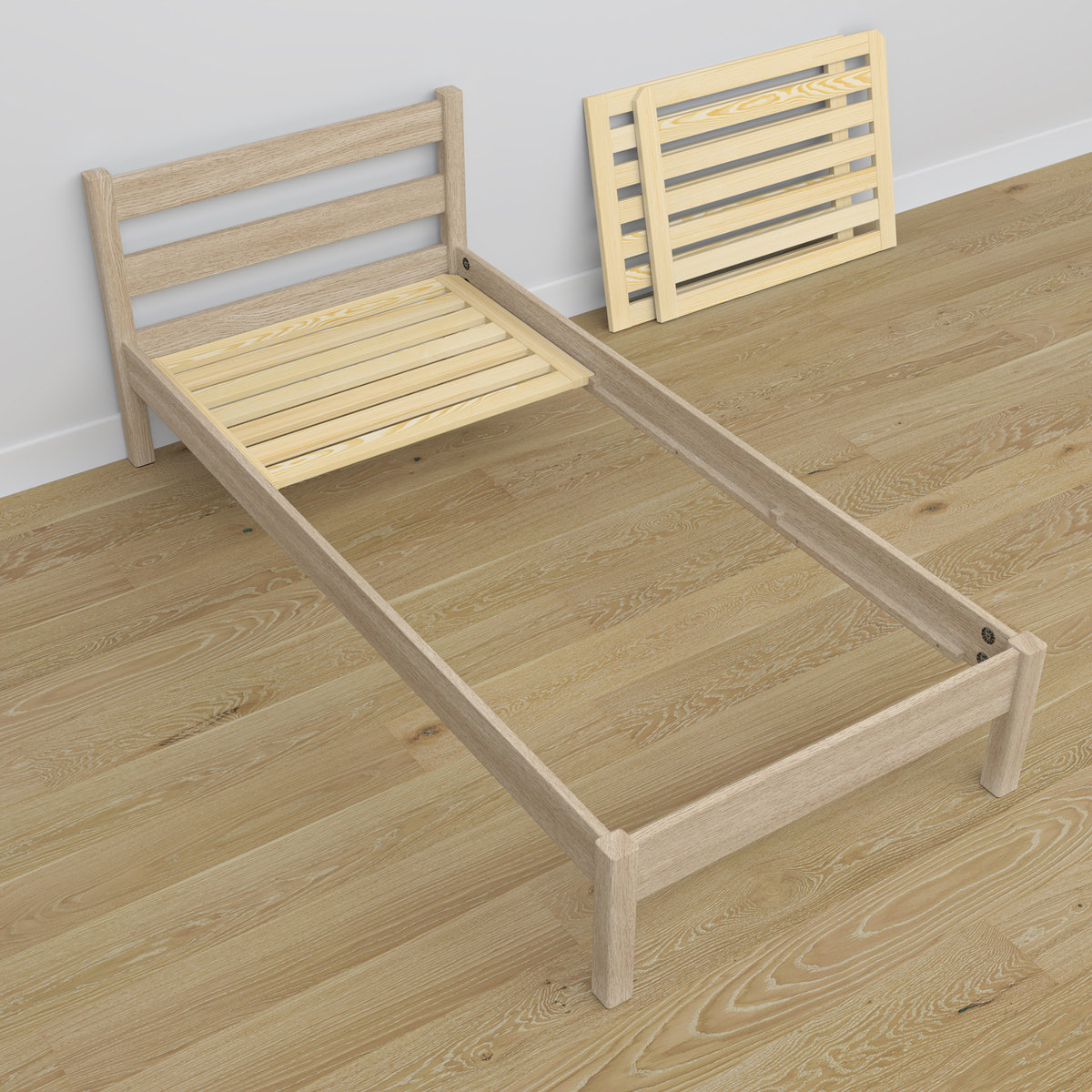 Łóżko jest sprzedawane w komplecie ze stelażem pod materac, przy czym materac nie jest częścią zestawu.
