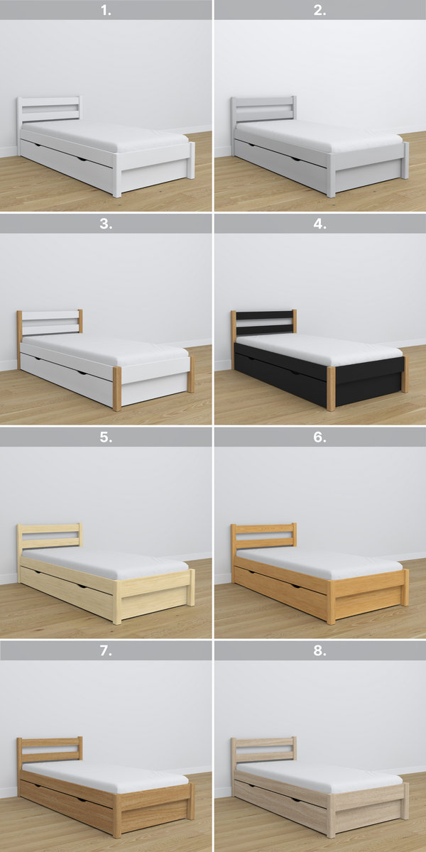 Drewniane łóżko pojedyncze N01 z szufladą jest również dostępne w wariancie bez szuflady lub z szufladą przeznaczoną na materac. Występuje także wielu opcjach kolorystycznych, które widoczne są na jednym ze zdjęć.