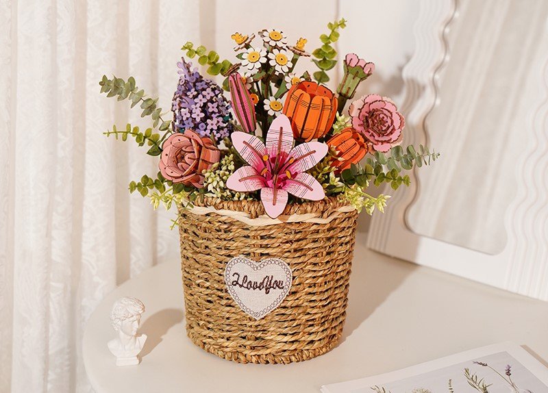 Udekoruj swoje życie drewnianym bukietem kwiatów Robotime-Rowood. Ten wykwintny zestaw zawiera wiele drewnianych kwiatów i roślin, w tym słonecznik, lilia, czerwoną kamelię, różową różę i eukaliptus itp.