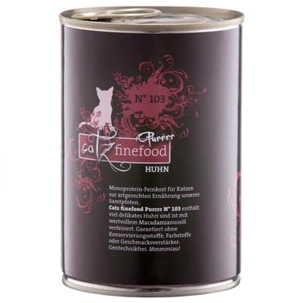 Catz Finefood Purrrr to luksusowa linia wysokiej jakości karm dla kotów, która nie tylko świetnie smakuje, ale jest również odpowiednia dla kotów wrażliwych na składniki odżywcze lub z nietolerancją pokarmową. Bez konserwantów, wzmacniaczy smaku, barwników i bez gumy kasja. GMO-free. Karma w swoim składzie nie zawiera zbóż i zawierają tylko jedno źródło białka zwierzęcego. Karma jest bezglutenowa i doskonale sprawdzi się w diecie kotów cierpiących na alergie oraz problemy trawienne. Catz Finefood Purrrr przygotowywane i opracowywane są w bliskiej współpracy z lekarzami weterynarii i dietetykami. Każdy taki posiłek dostarczy wiele wartościowych witamin oraz taurynę, która wspomaga funkcjonowanie mięśnia sercowego oraz wzroku u Twojego kota.