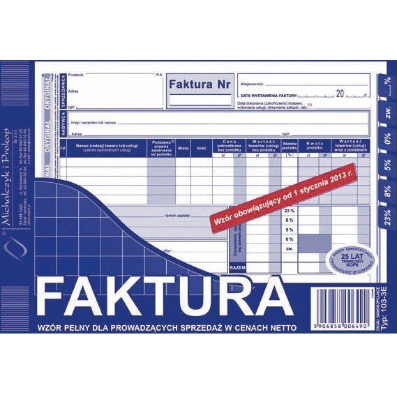 druk, faktura netto pełna rodzaj papieru: samokopiujący format: A5 bloczek 80 kartek druk jednostronny (oryginał + kopia)