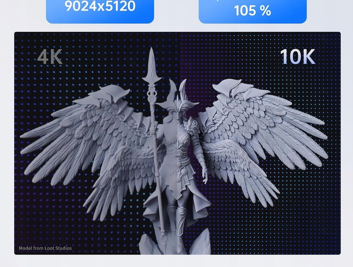 - 7'' 10K HD Mono LCD: Anycubic Photon Mono 4 jest wyposażony w 7'' 10k mono LCD ekran o rozdzielczości 9024x5120, oś XY 17x17um pikseli, 105% większa dokładność drukowania w porównaniu do swojego poprzednika. Te ulepszone możliwości umożliwiają tworzenie modeli o wyjątkowych szczegółach i bogactwie dynamicznym.