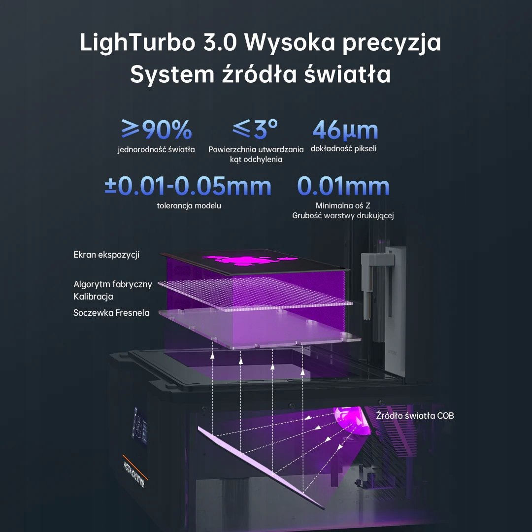 Photon Mono M7 Max to zaawansowana drukarka 3D do żywicy, oferująca przełomową technologię, która umożliwia tworzenie precyzyjnych modeli o wysokiej jakości. Wyposażona w system LightTurbo 3.0, gwarantuje stabilne i równomierne naświetlanie, co przekłada się na doskonałą dokładność i niezawodność wydruków.