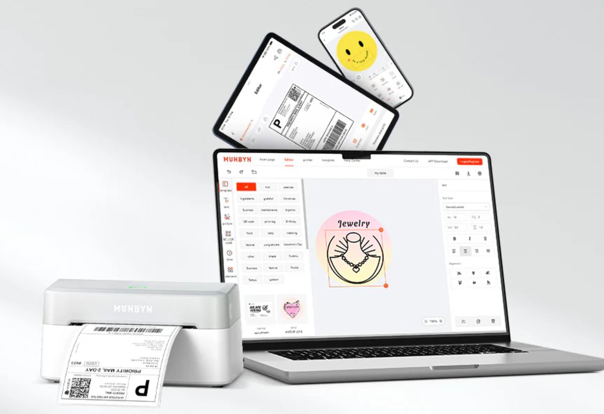 Dzięki darmowej aplikacji MUNBYN Print (na iOS i Androida), zyskujesz dostęp do ponad 2 000 gotowych szablonów, 3500 elementów graficznych i 80 stylowych fontów – idealne do etykiet na