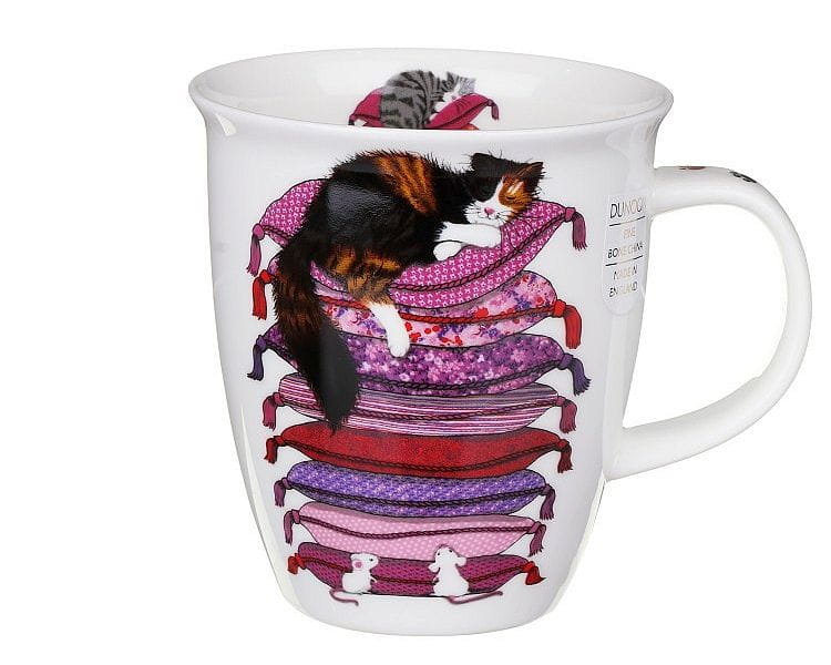 Dunoon, kubek NEVIS - Sleepy Cats Pink, śpiący kot "Sleepy Cats Pink" to motyw w dużej części w odcieniach różowego koloru, przedstawiający śpiącego na ośmiu poduszkach kota(po obu stronach innego) ...