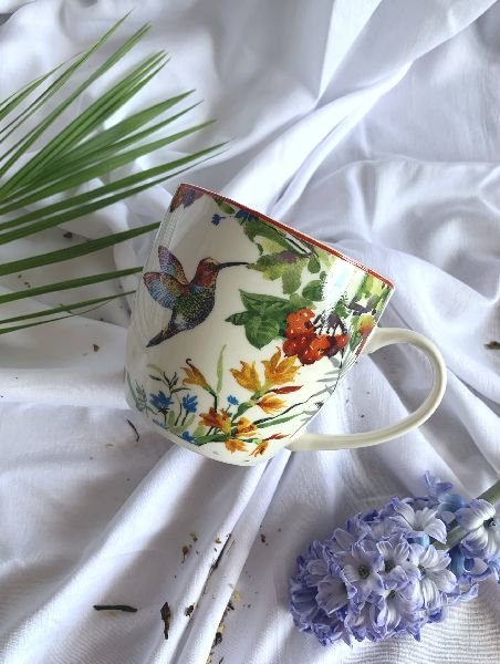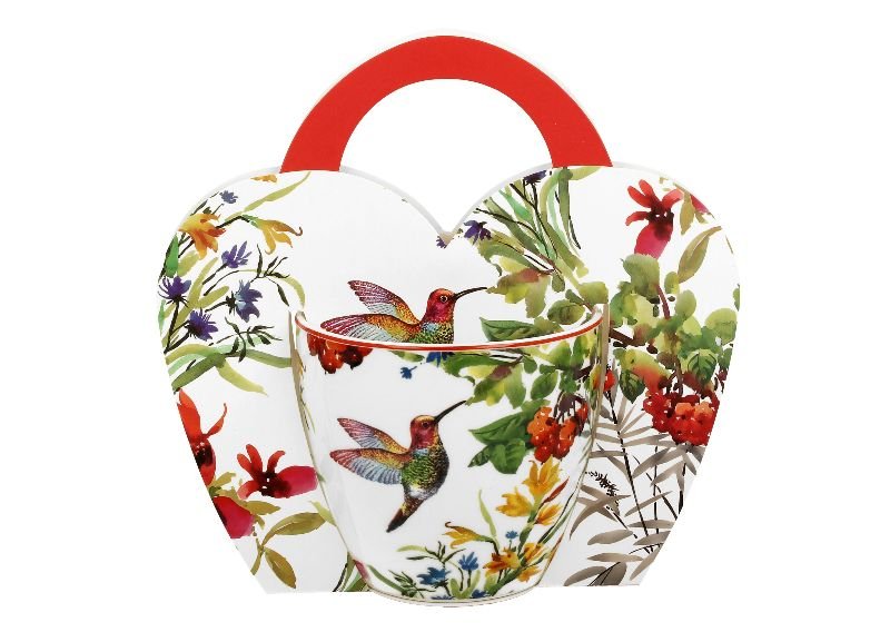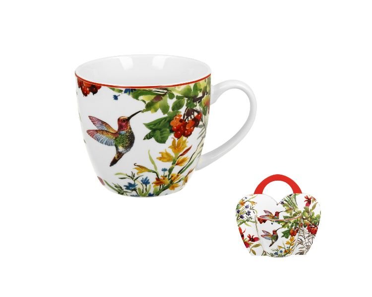 Kubek Linnea 460 ml Wykonany z porcelany New Bone China. Linia zdobiona motywem kwiatów w wyrazistych kolorach wraz z kolibrem. Całość zapakowana w oryginalne opakowanie z uchwytem z tym samym