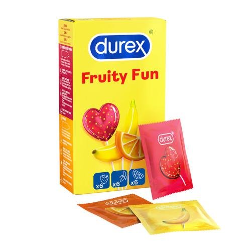 DUREX FRUITY FUN Prezerwatywy pokryte owocowym lubrykantem Prezerwatywy Durex Fruity Fun wykonane są z naturalnej gumy lateksowej i pokryte owocowym lubrykantem. Cienka, naturalna guma lateksowa daje poczucie większej bliskości i zapewnia wspaniałe doznania. Smakowy, owocowy lubrykant nawilża, umożliwia lepszy poślizg oraz poprawia komfort współżycia, a także urozmaica intymne chwile. Prezerwatywy posiadają komfortowy kształt, odpowiednio dopasowany rozmiar i są zakończone specjalnym zbiorniczkiem. W zestawie znajdują się prezerwatywy pokryte lubrykantem w trzech różnych smakach: truskawkowym, bananowym i pomarańczowym. Dlaczego prezerwatywy Durex Fruity Fun?