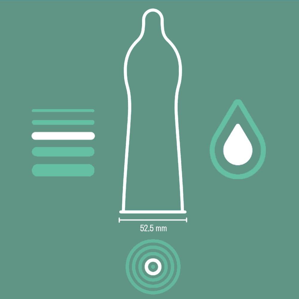 Prezerwatywy lateksowe Dopasowane o gładkiej powierzchni i kształcie Easy-on, zakończone zbiorniczkiem, pokryte silikonowym lubrykantem.