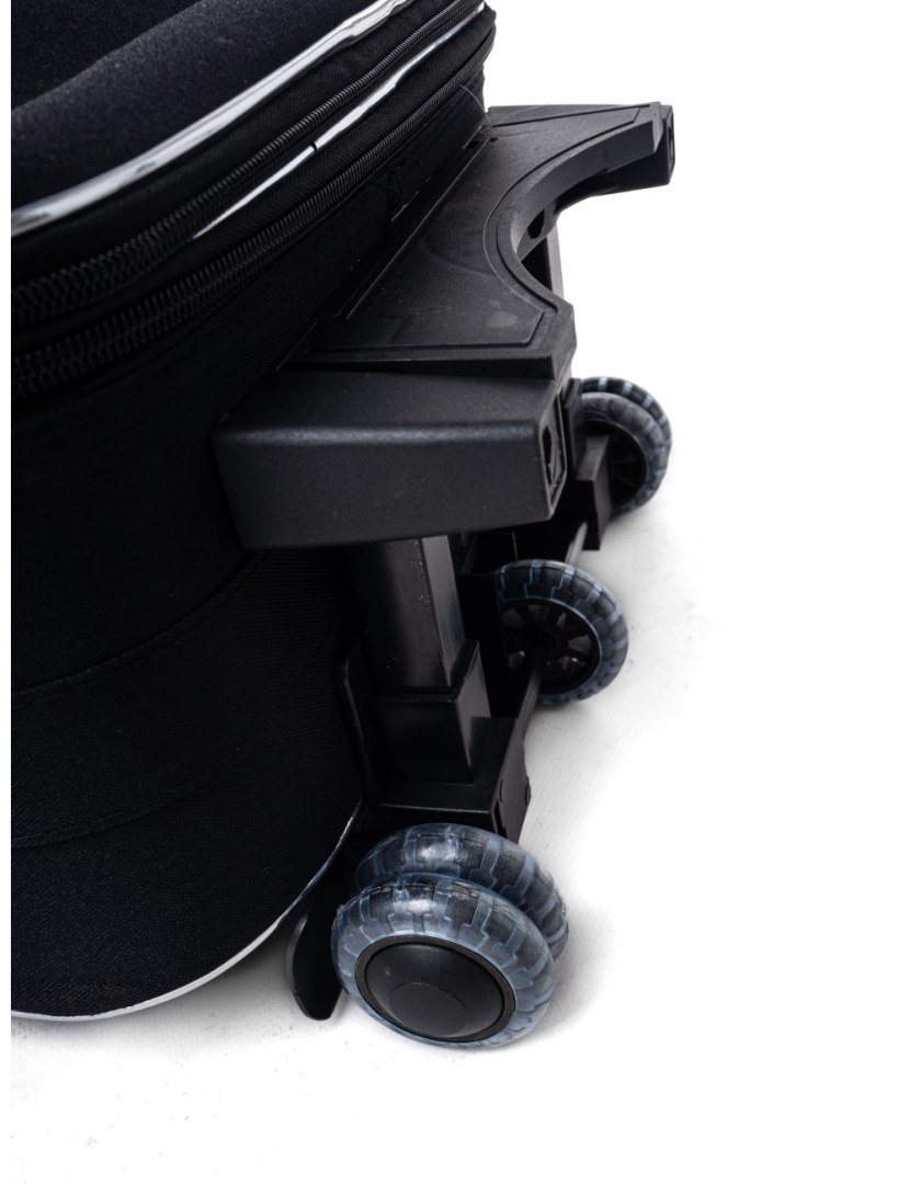 Kolekcja modelu 773 posiada dwa solidne uchwyty, górny i boczny, co zapewnia komfort w przemieszczaniu się z bagażem, na przykład po schodach. Koło uchwytu górnego umieściliśmy wbudowany zamek szyfrowy, to bardzo istotne, przy wyborze bagażu, aby zwrócić uwagę na kwestię bezpieczeństwa rzeczy osobistych. Model 773 posiada możliwość poszerzenia przestrzeni użytkowej o, aż 5 cm, oraz dwie pojemne kieszonki znajdujące się na froncie walizki. Mocne szwy pozwalają na maksymalne zapakowanie bagażu bez obawy o uszkodzenia, to duży plus walizek miękkich. Torba wprost stworzona jest dla miłośników podróży, jako podkreślenie jej charakteru oraz unikatowy dodatek na wysuwanej rączce stelaża umieszczony został mały kompas. Kwestia wyjątkowości tego modelu jest więc niepowtarzalna, powracając natomiast do praktycznych zastosowań, jakie można zauważyć w tym modelu, nie powinny umknąć uwadze kółka, oraz wysuwana stopka. Zastosowanie większej ilości kółek, bo aż pięciu oraz możliwość wysunięcia stopki, która pozwala na utrzymanie w pozycji pionowej, nawet mocno wypchanego bagażu. Walizka posiada również cztery stopki stabilizacyjne, które pozwalają położyć bagaż na podłodze bez obawy o zabrudzenia, czy przetarcia, ponadto poprzez ich boczne umiejscowienie bagaż zajmuje znacznie mniej miejsca.
