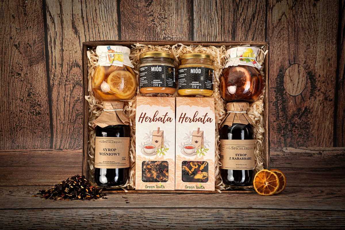 Duży kosz prezentowy pełen pyszności;herbaty owocowe;syropy;miody i cytrynki Prezent nie musi być nudny! Dlatego włożyliśmy do pudełka niebanalne produkty;które swoją kompozycją tworzą prezent ...