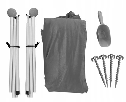 Napełnij podstawę namiotu piaskiem do rozmiaru piłki, używając łopatki dołączonej do zestawu, obciążenie zapewni stabilną pozycję namiotu, nawet przy mocniejszych podmuchach wiatru. Namiot bardzo prosto szybko można rozłyć, w zestawie instrukcja w j. polskim.
