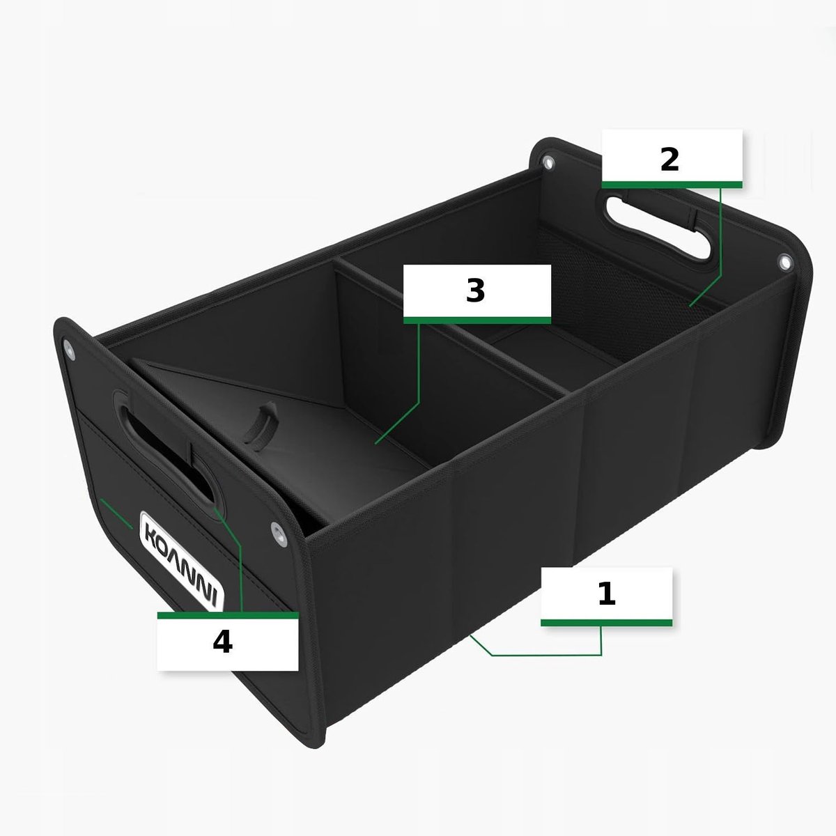 Wnętrze podzielone na 2 komory oraz dodatkowe siatki umieszczone doskonale nadają się do przechowywania mniejszych przedmiotów. Obsługa torby jest ekspresowa, łatwa i bezproblemowa. Posiada wbudowane rączki, dzięki temu chwyt jest pewny i nie popsuje się nawet przy intensywnym użytkowaniu. Przy jego pomocy bez problemu zachowasz porządek w bagażniku swojego samochodu.