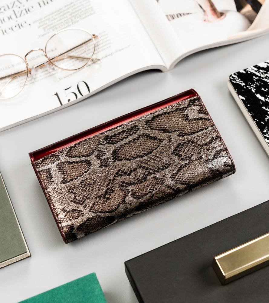 #️⃣ Rewelacyjny design | Portfel o klasycznym fasonie i najmodniejszym wzorze skóry węża w złotym kolorze. Model w orientacji poziomej zapinany klapką na zatrzask